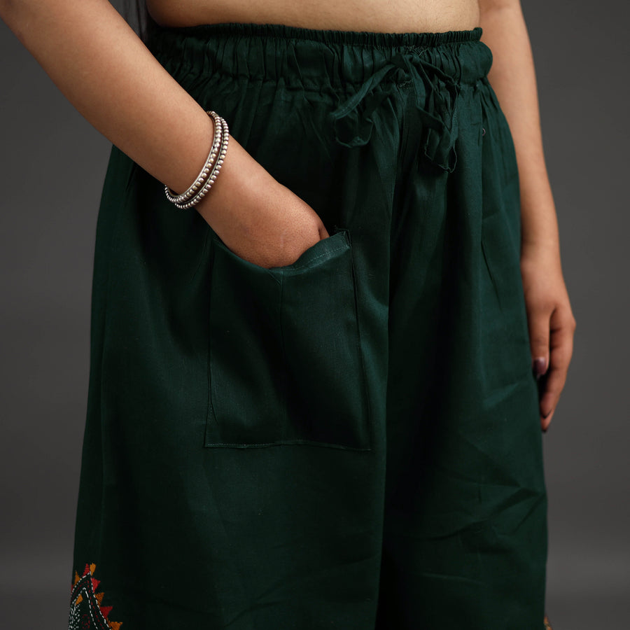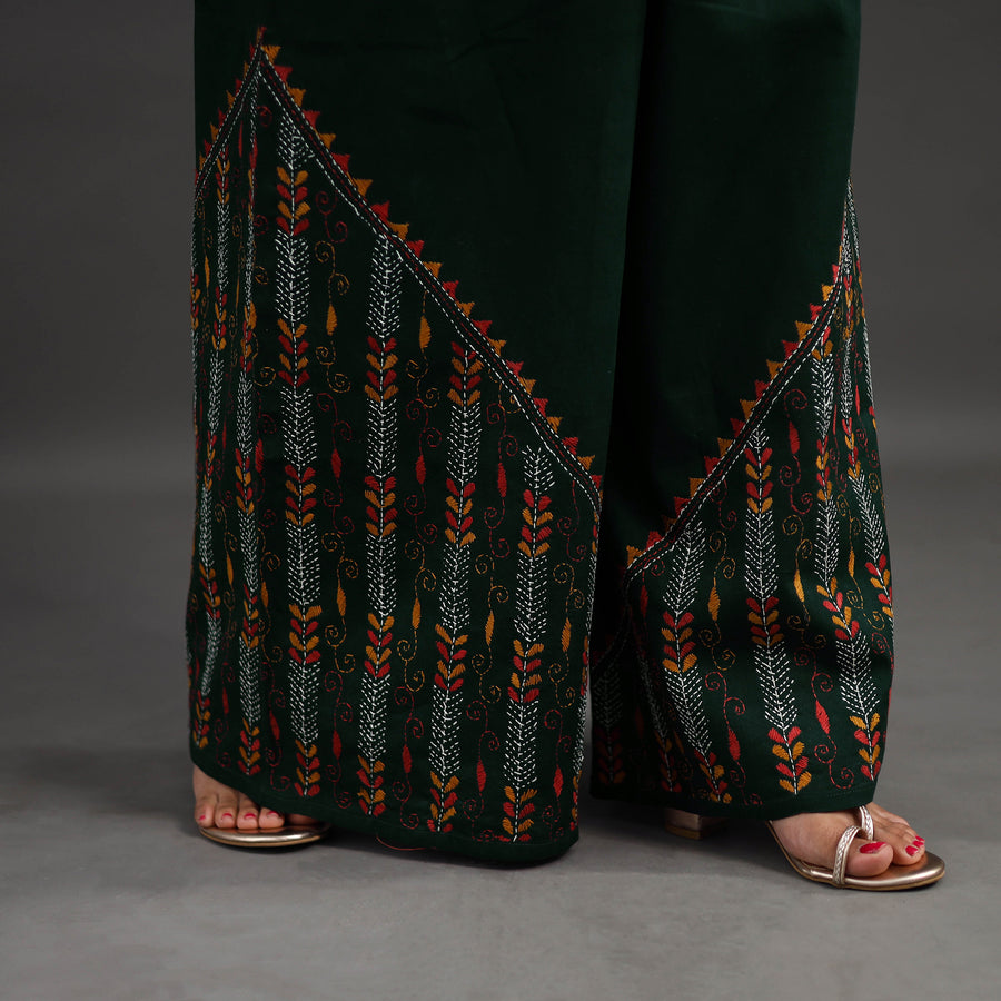 Experience comfort and style with our dark green bengal cotton kantha hand embroidery palazzo. This palazzo is designed with traditional patterns and has been hand embroidered using West Bengal traditional craft technique of Kantha. The intricate Kantha embroidery adds a touch of elegance and sophistication to your outfit while the wide leg design ensures comfort making it perfect for all day wear.