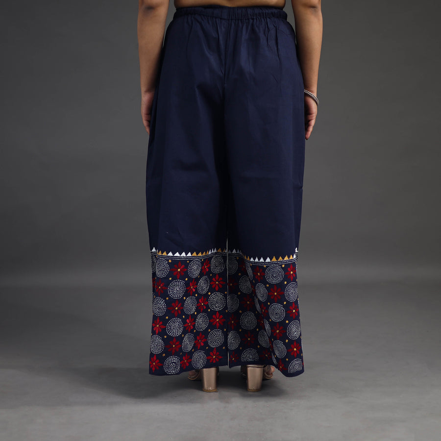 Experience comfort and style with our navy blue bengal cotton kantha hand embroidery palazzo. This palazzo is designed with traditional patterns and has been hand embroidered using West Bengal traditional craft technique of Kantha. The intricate Kantha embroidery adds a touch of elegance and sophistication to your outfit while the wide leg design ensures comfort making it perfect for all day wear.
