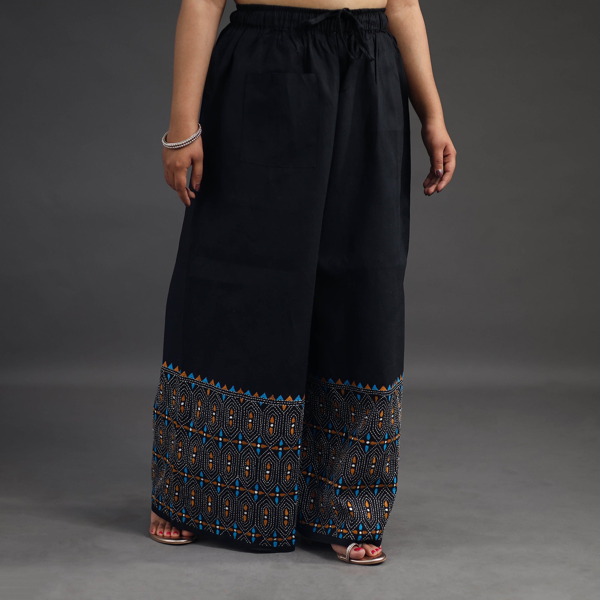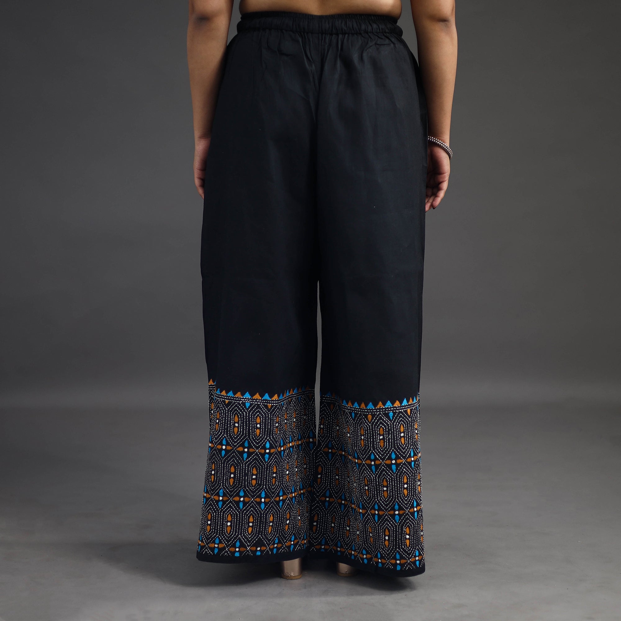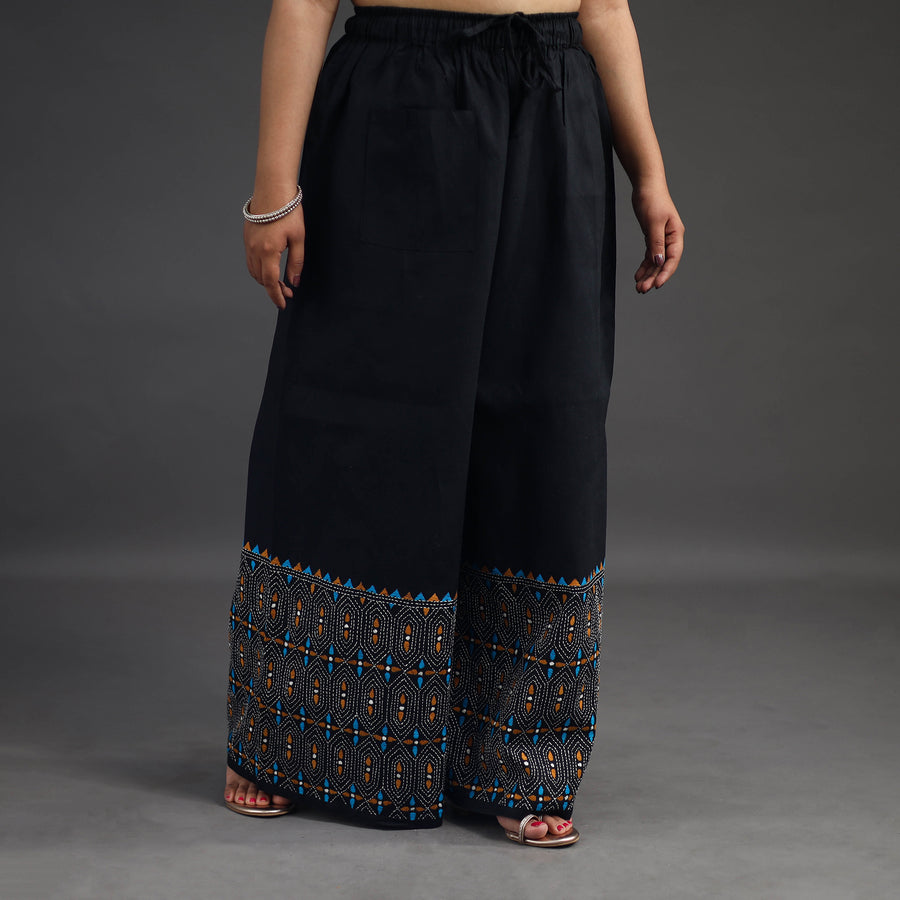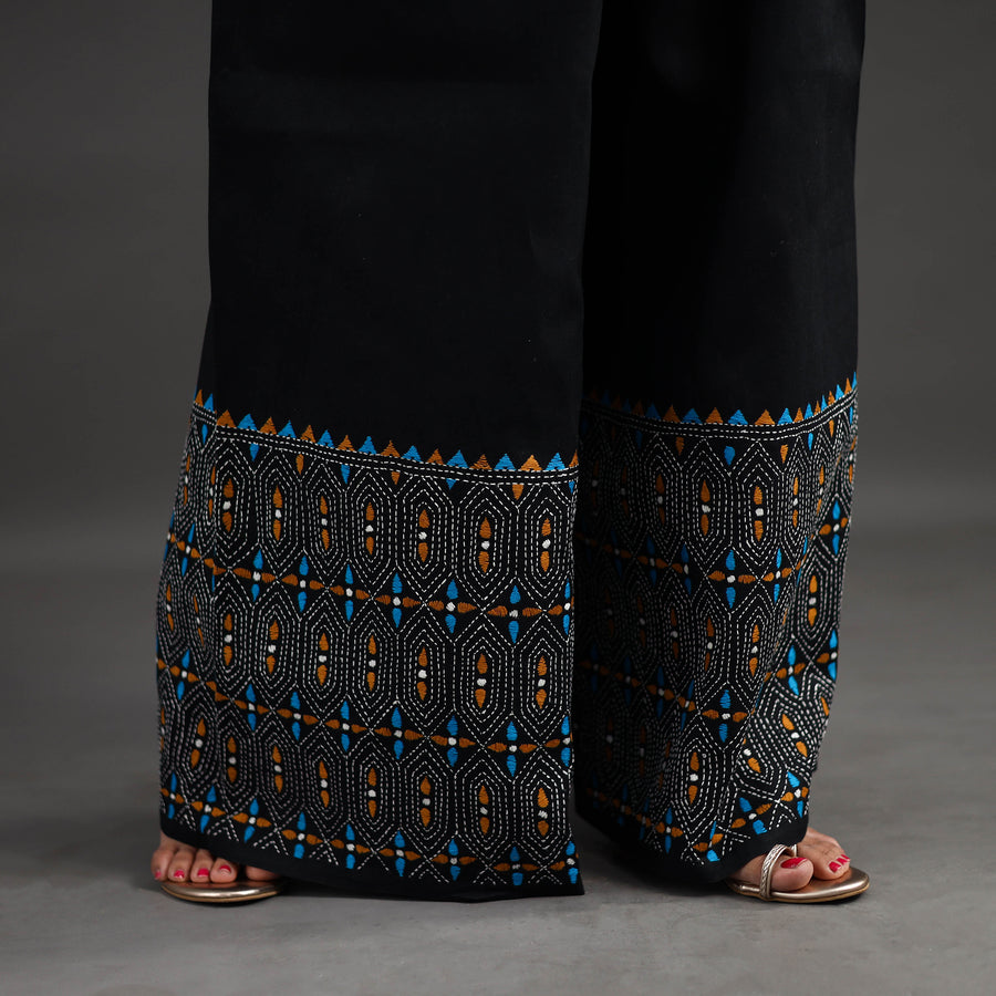 Experience comfort and style with our black bengal cotton kantha hand embroidery palazzo. This palazzo is designed with traditional patterns and has been hand embroidered using West Bengal traditional craft technique of Kantha. The intricate Kantha embroidery adds a touch of elegance and sophistication to your outfit while the wide leg design ensures comfort making it perfect for all day wear.