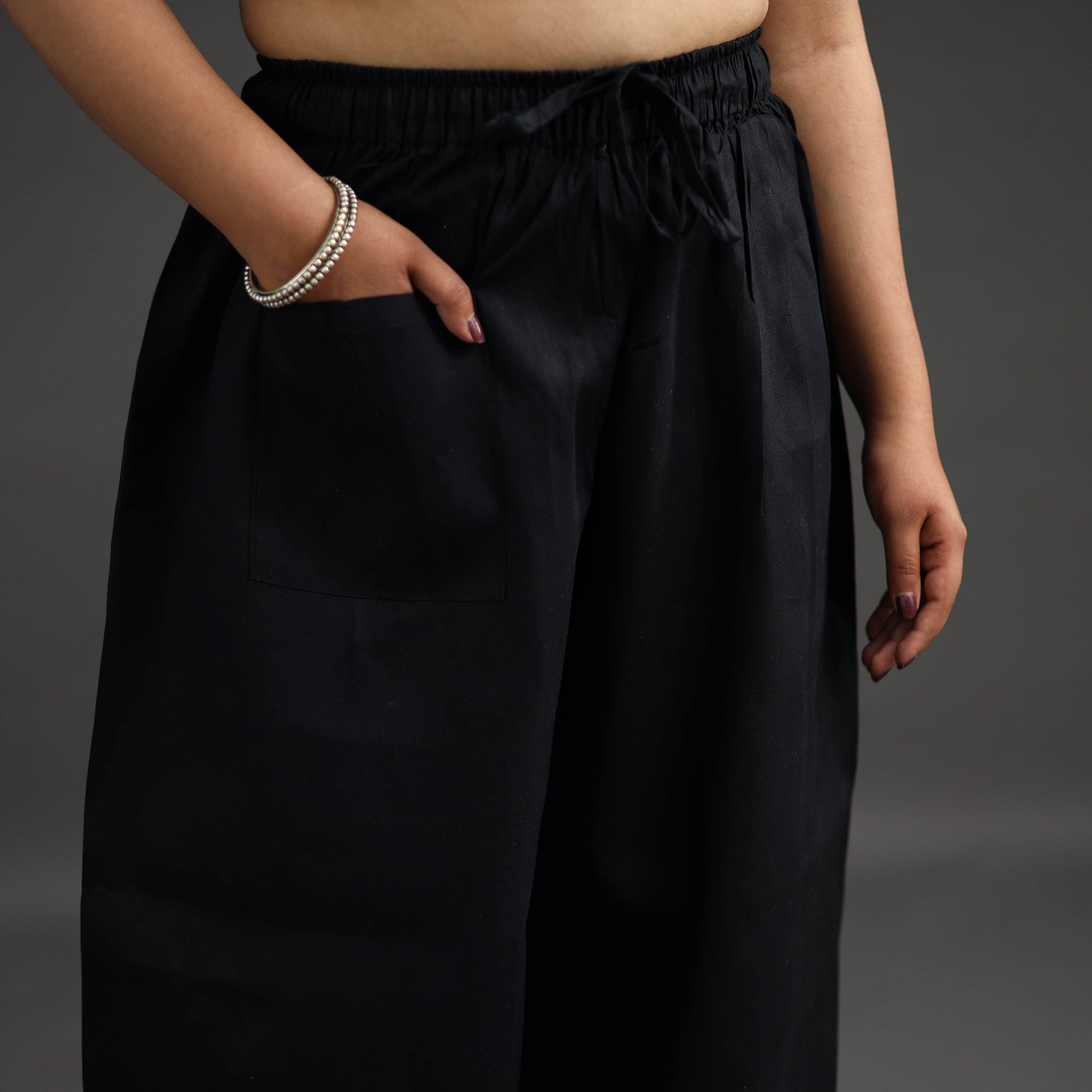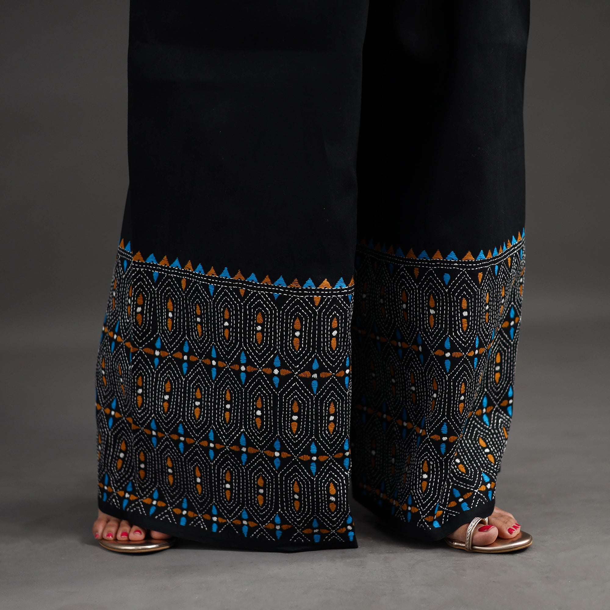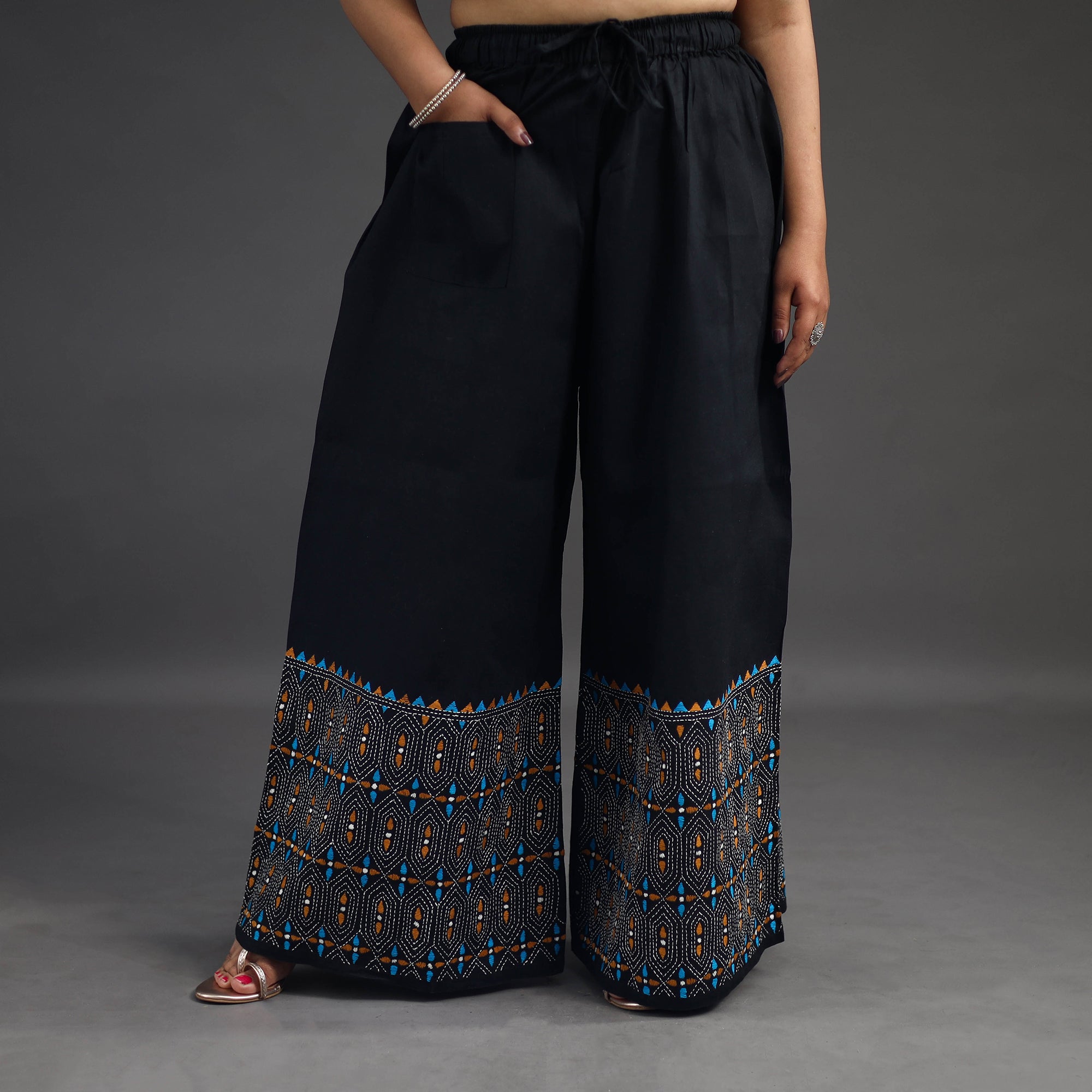 Experience comfort and style with our black bengal cotton kantha hand embroidery palazzo. This palazzo is designed with traditional patterns and has been hand embroidered using West Bengal traditional craft technique of Kantha. The intricate Kantha embroidery adds a touch of elegance and sophistication to your outfit while the wide leg design ensures comfort making it perfect for all day wear.