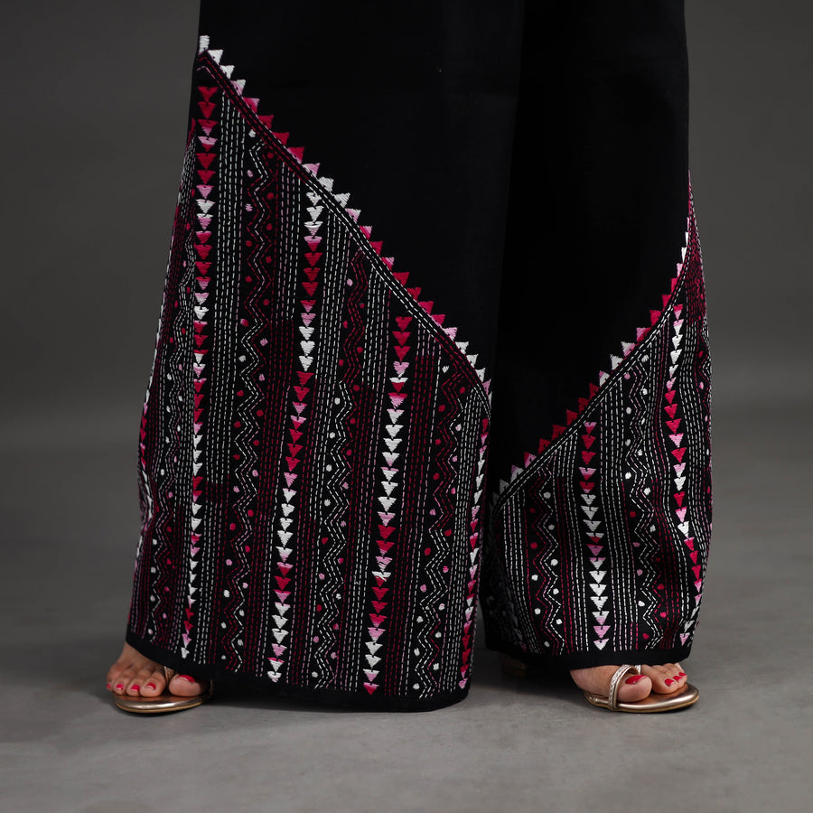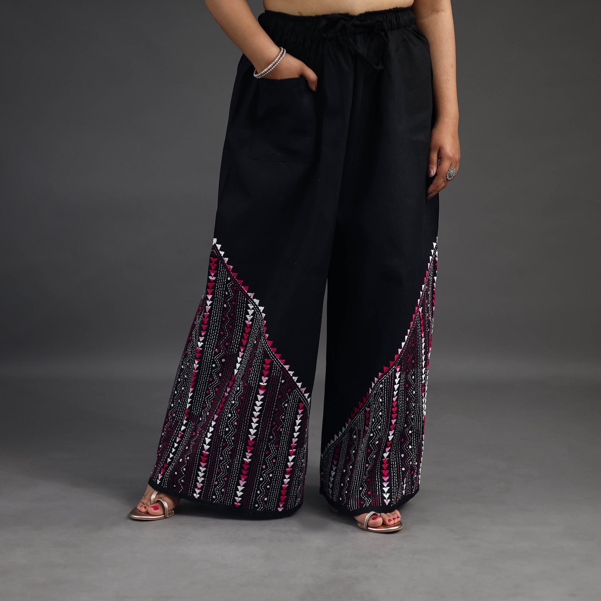 Experience comfort and style with our black bengal cotton kantha hand embroidery palazzo. This palazzo is designed with traditional patterns and has been hand embroidered using West Bengal traditional craft technique of Kantha. The intricate Kantha embroidery adds a touch of elegance and sophistication to your outfit while the wide leg design ensures comfort making it perfect for all day wear.