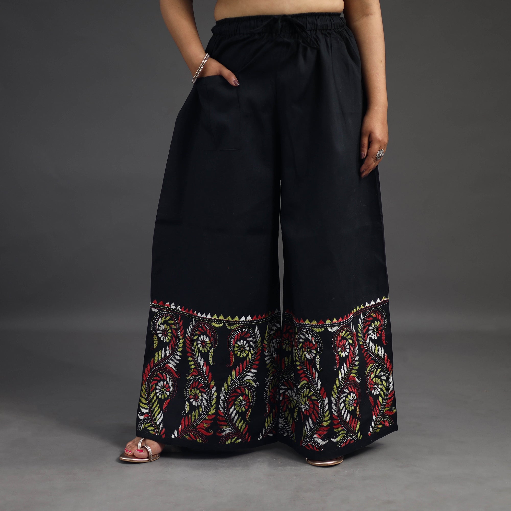 Experience comfort and style with our black bengal cotton kantha hand embroidery palazzo. This palazzo is designed with traditional patterns and has been hand embroidered using West Bengal traditional craft technique of Kantha. The intricate Kantha embroidery adds a touch of elegance and sophistication to your outfit while the wide leg design ensures comfort making it perfect for all day wear.