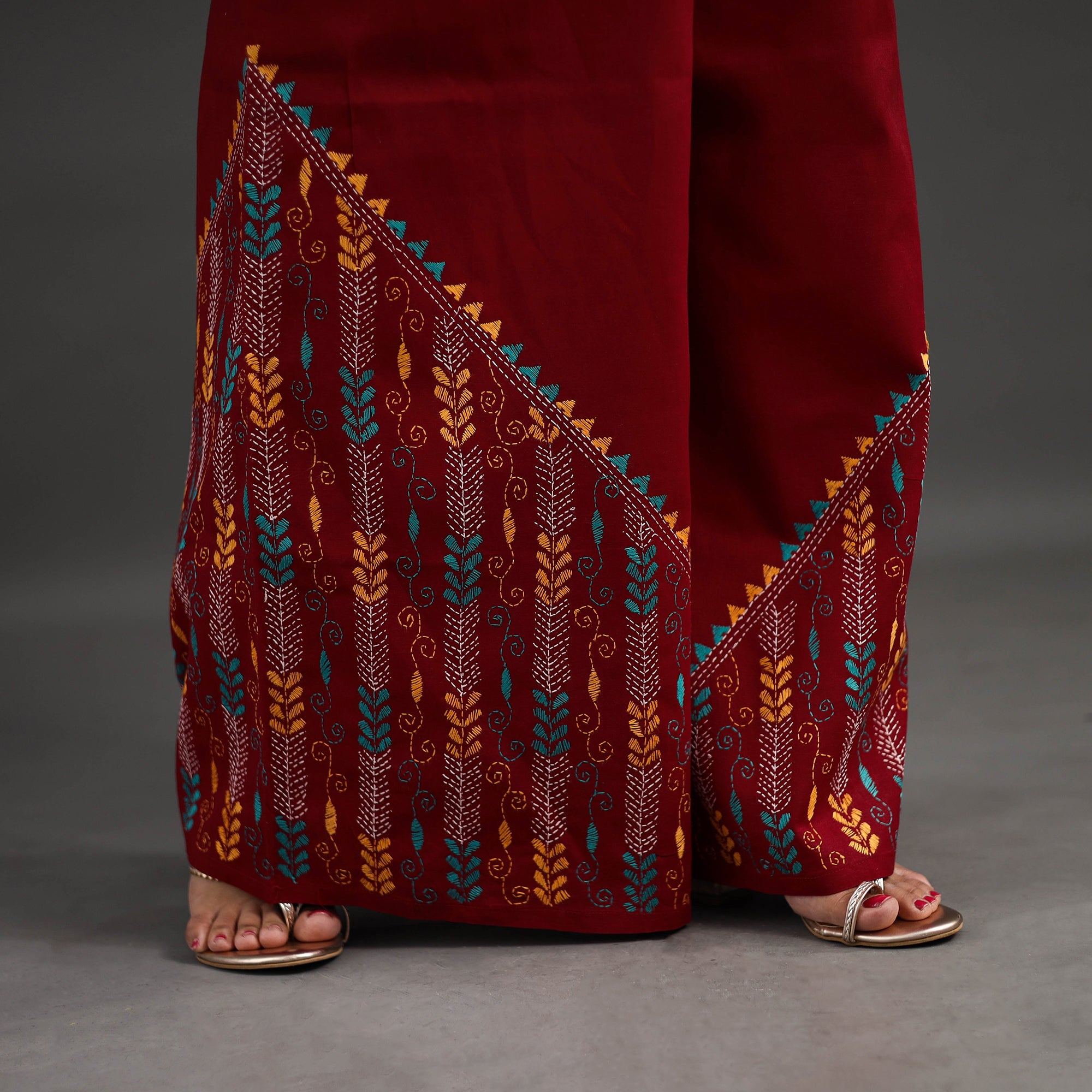 Experience comfort and style with our red bengal cotton kantha hand embroidery palazzo. This palazzo is designed with traditional patterns and has been hand embroidered using West Bengal traditional craft technique of Kantha. The intricate Kantha embroidery adds a touch of elegance and sophistication to your outfit while the wide leg design ensures comfort making it perfect for all day wear.