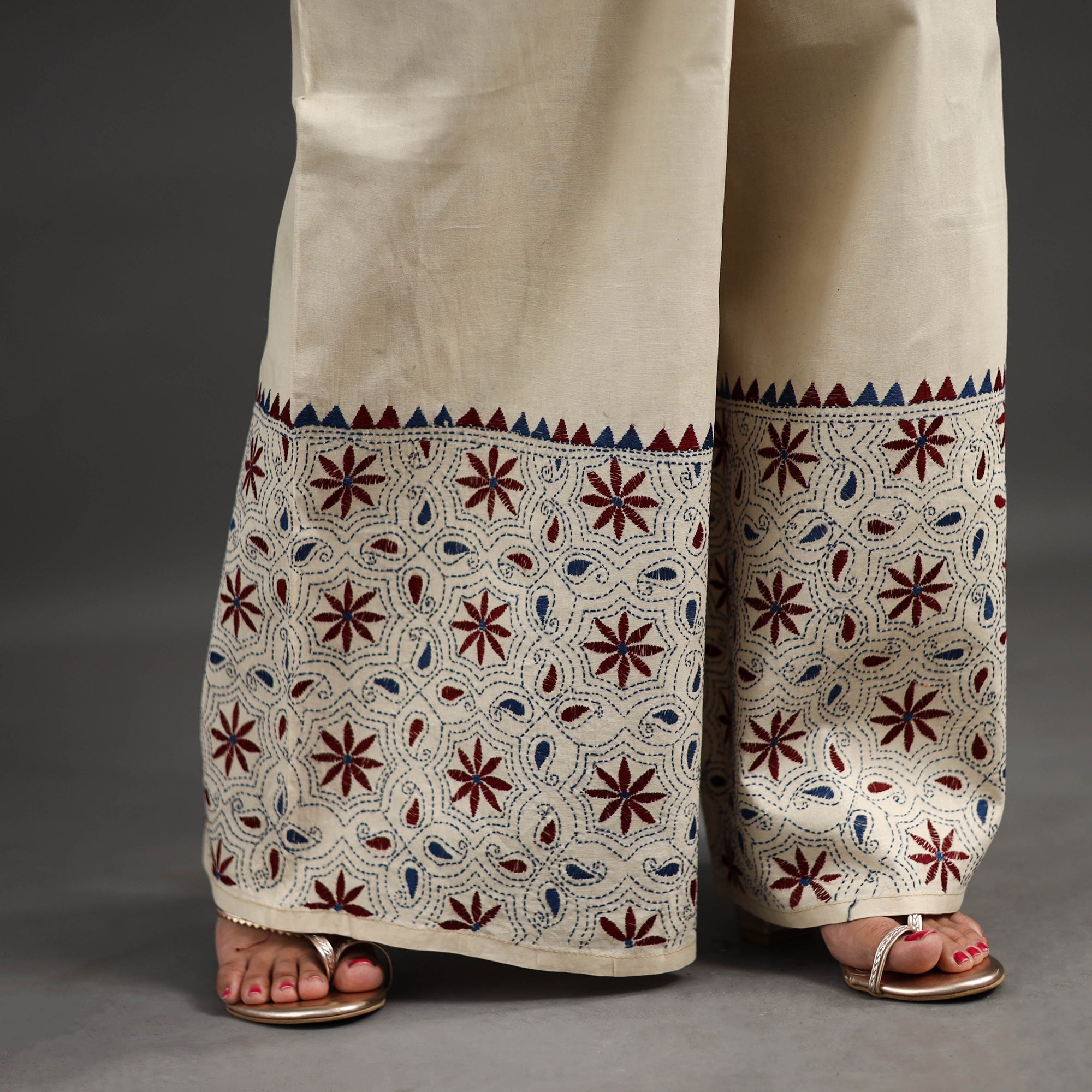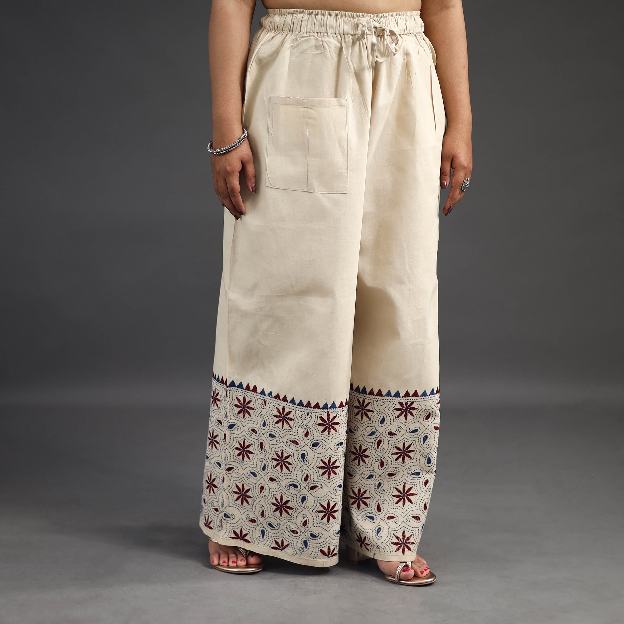 Experience comfort and style with our beige bengal cotton kantha hand embroidery palazzo. This palazzo is designed with traditional patterns and has been hand embroidered using West Bengal traditional craft technique of Kantha. The intricate Kantha embroidery adds a touch of elegance and sophistication to your outfit while the wide leg design ensures comfort making it perfect for all day wear.