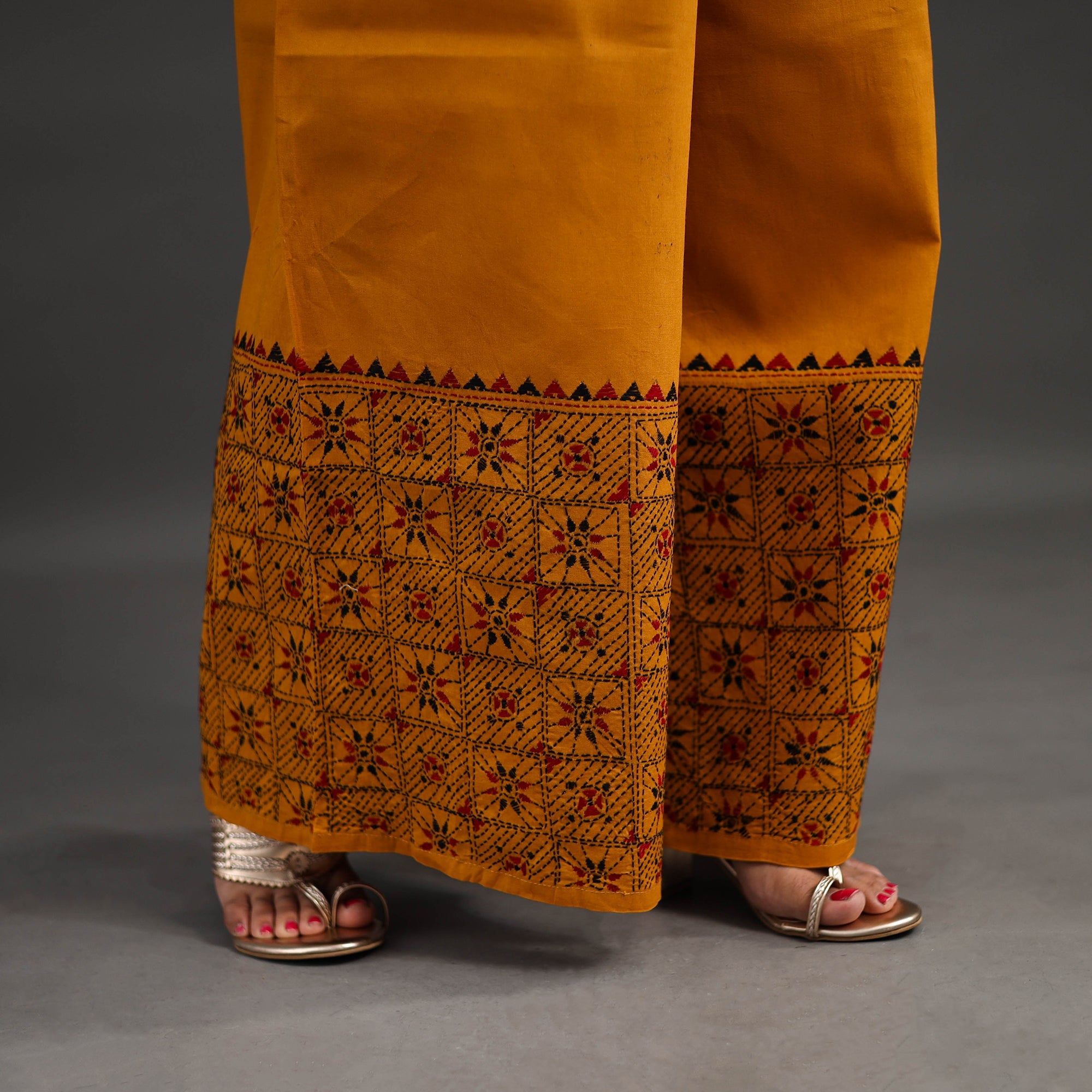Experience comfort and style with our orange bengal cotton kantha hand embroidery palazzo. This palazzo is designed with traditional patterns and has been hand embroidered using West Bengal traditional craft technique of Kantha. The intricate Kantha embroidery adds a touch of elegance and sophistication to your outfit while the wide leg design ensures comfort making it perfect for all day wear.