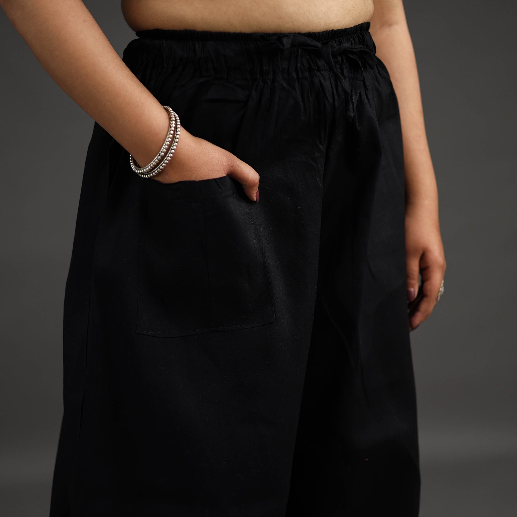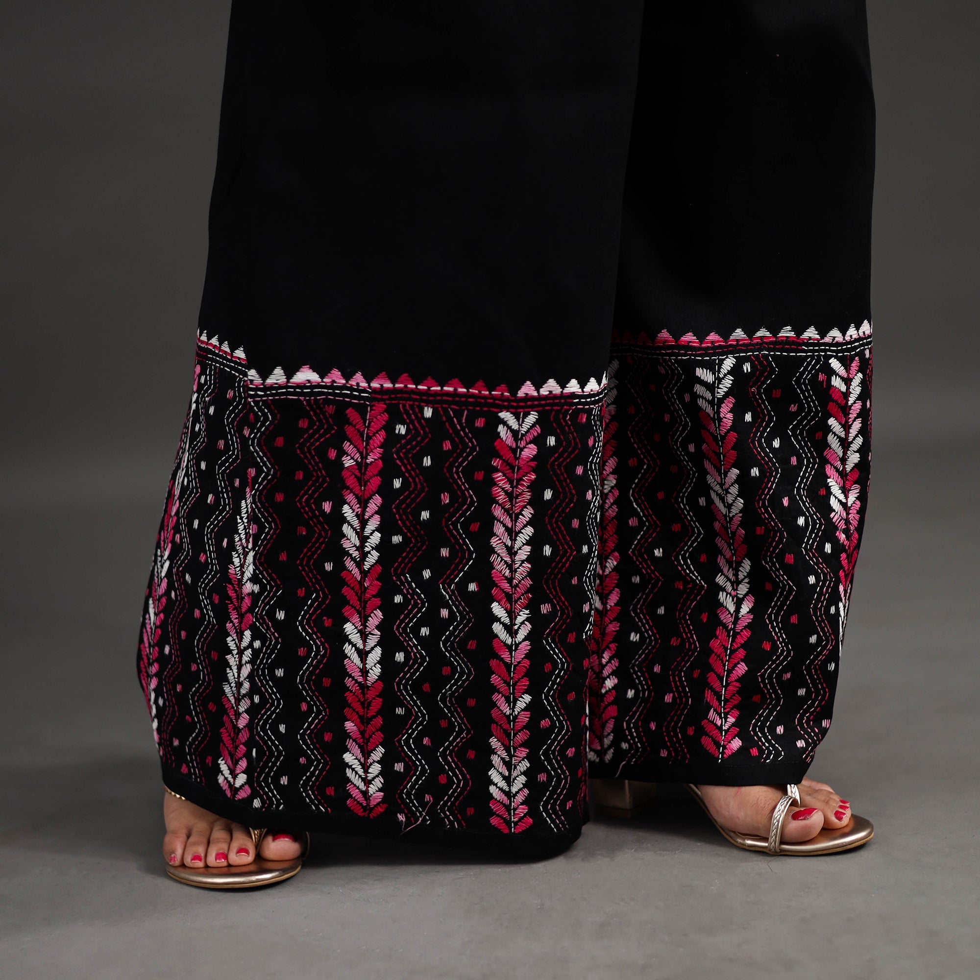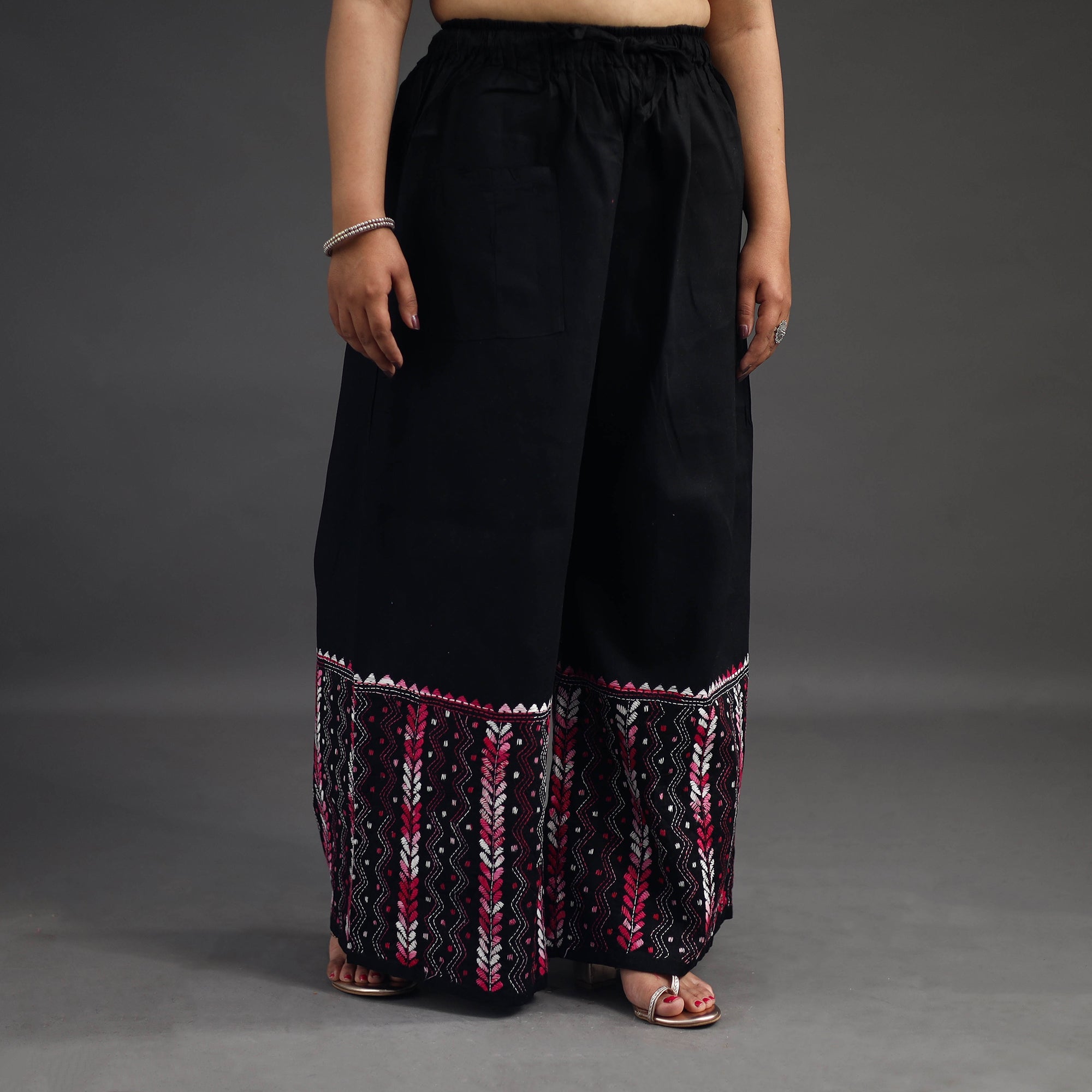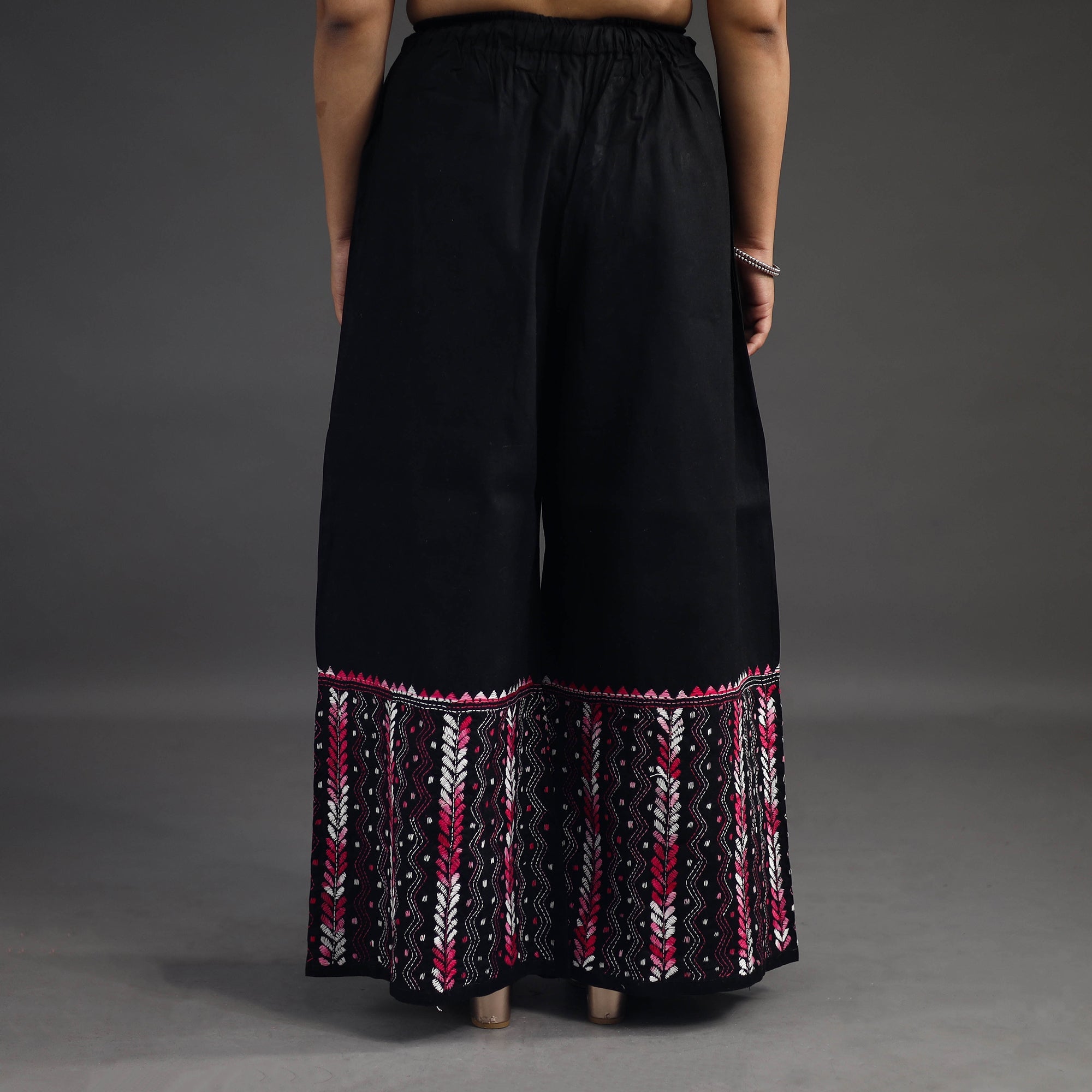 Experience comfort and style with our black bengal cotton kantha hand embroidery palazzo. This palazzo is designed with traditional patterns and has been hand embroidered using West Bengal traditional craft technique of Kantha. The intricate Kantha embroidery adds a touch of elegance and sophistication to your outfit while the wide leg design ensures comfort making it perfect for all day wear.