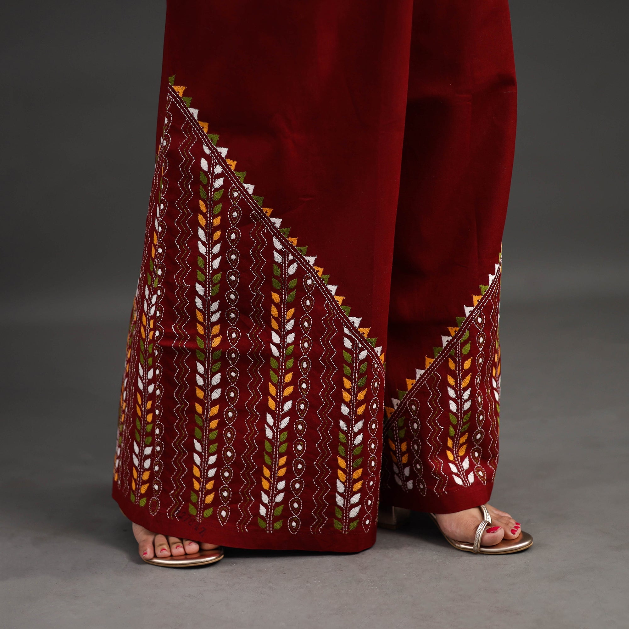 Experience comfort and style with our red bengal cotton kantha hand embroidery palazzo. This palazzo is designed with traditional patterns and has been hand embroidered using West Bengal traditional craft technique of Kantha. The intricate Kantha embroidery adds a touch of elegance and sophistication to your outfit while the wide leg design ensures comfort making it perfect for all day wear.