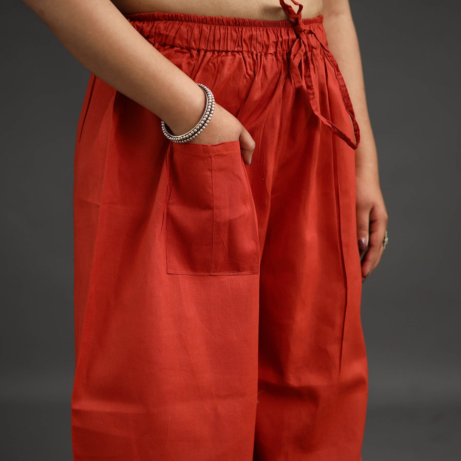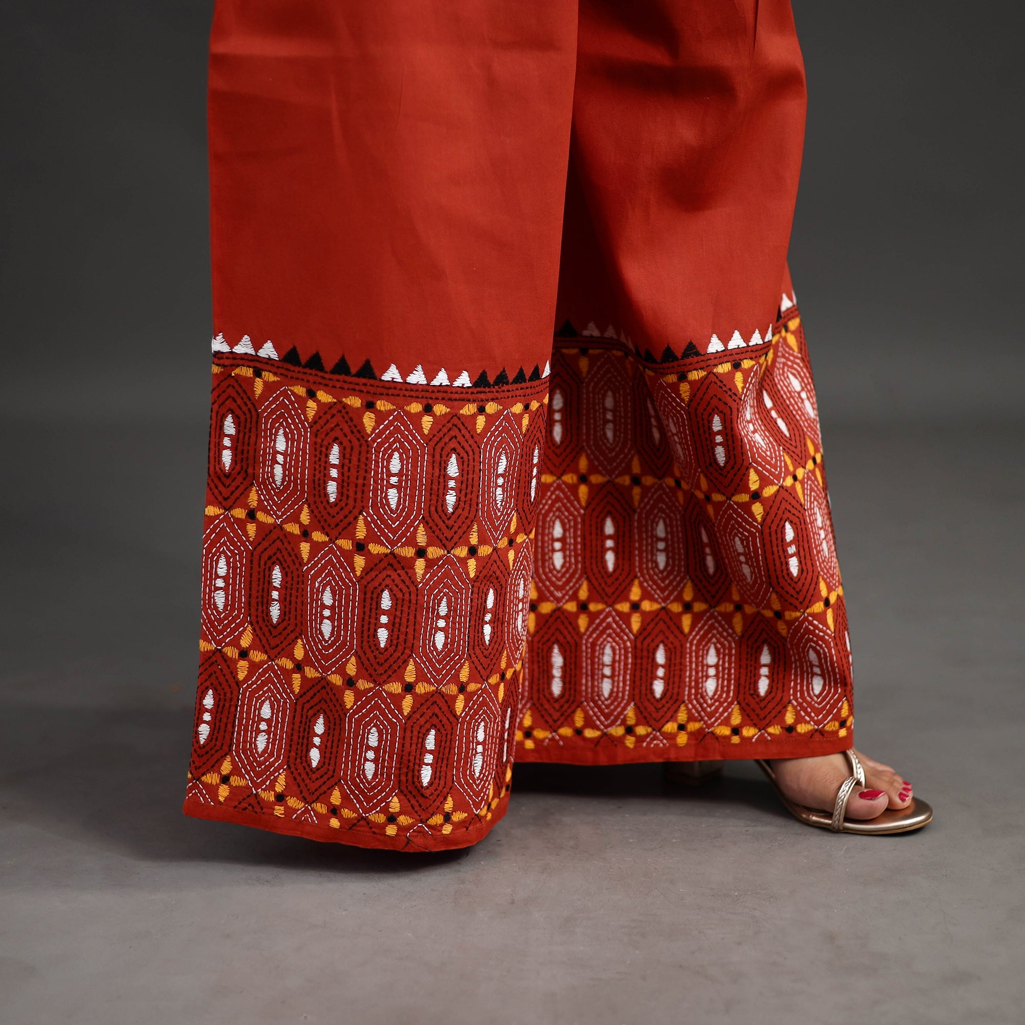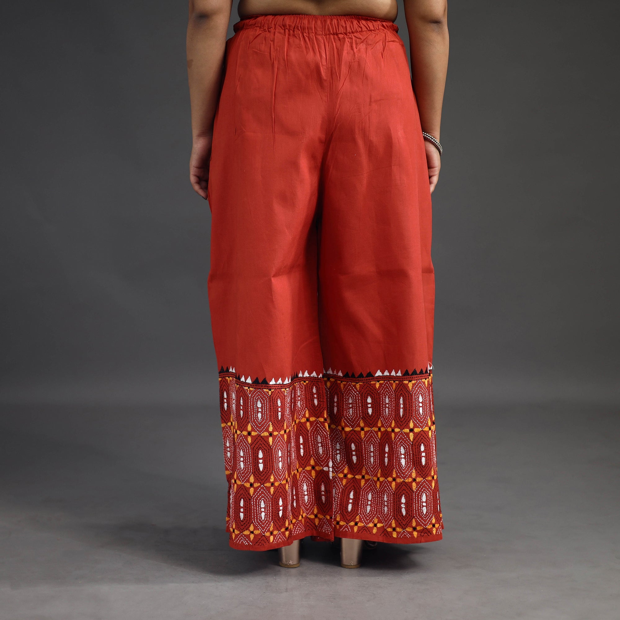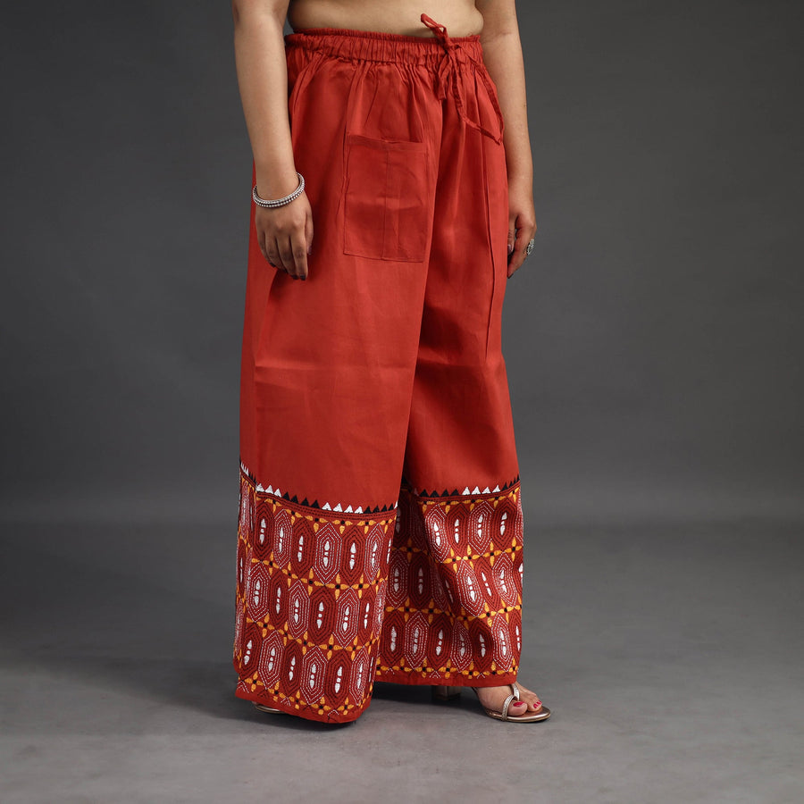 Experience comfort and style with our orange bengal cotton kantha hand embroidery palazzo. This palazzo is designed with traditional patterns and has been hand embroidered using West Bengal traditional craft technique of Kantha. The intricate Kantha embroidery adds a touch of elegance and sophistication to your outfit while the wide leg design ensures comfort making it perfect for all day wear.