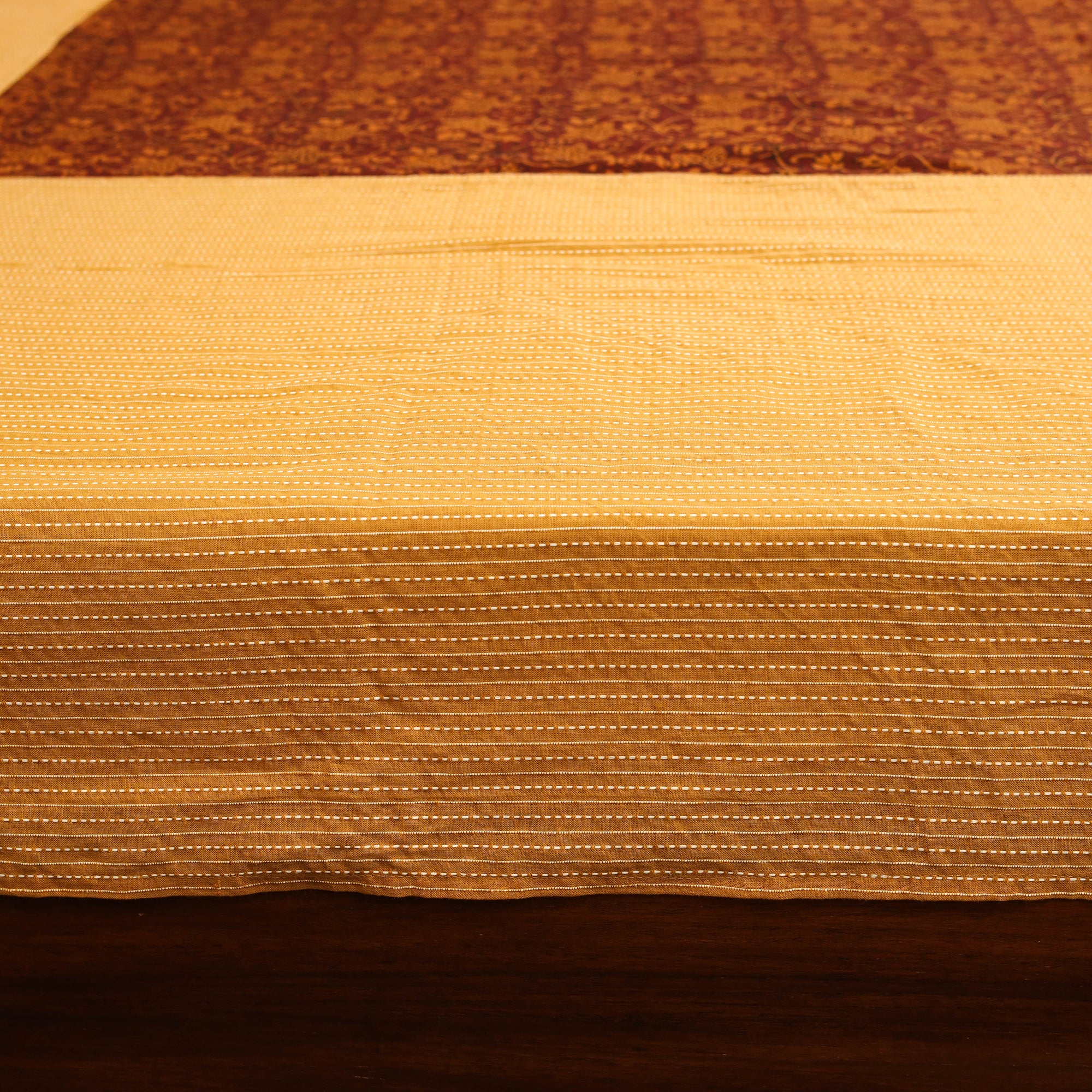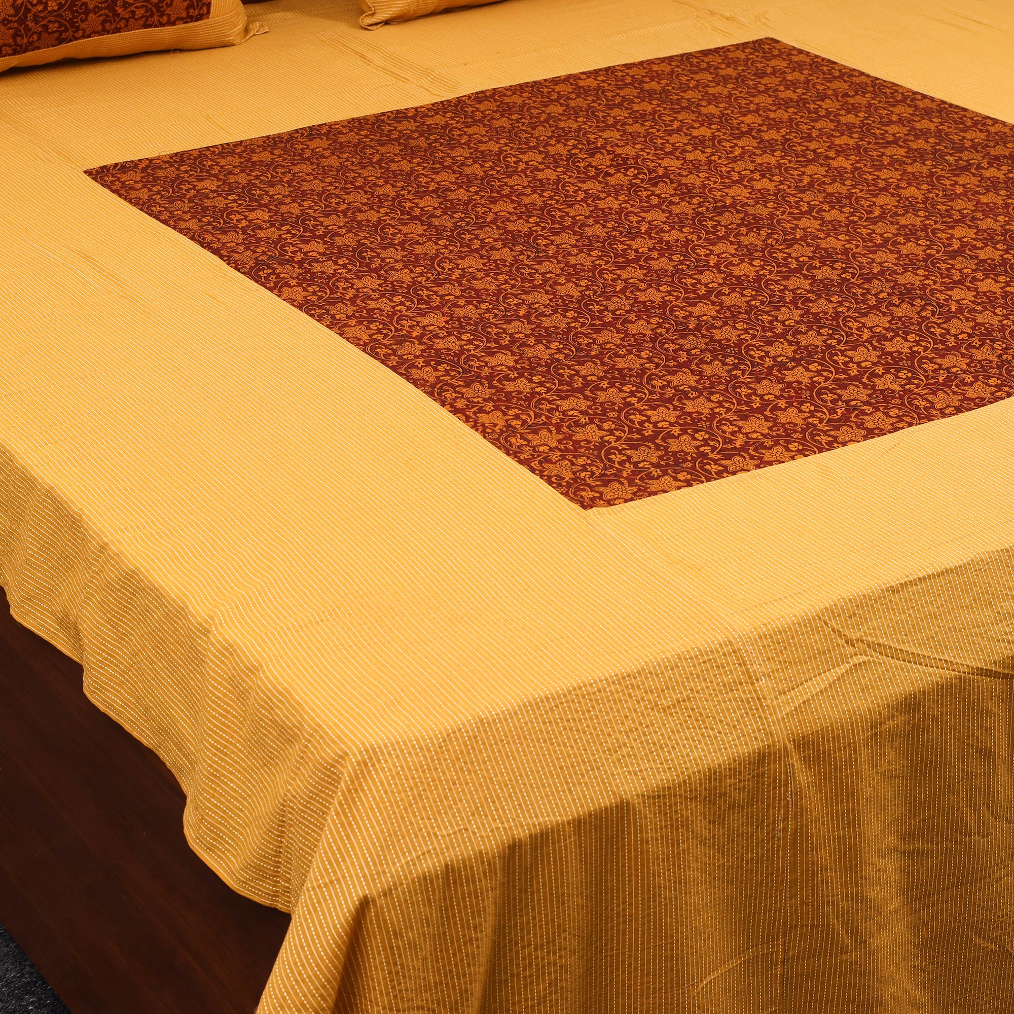 This yellow cotton bedsheet set features a beautiful blend of kantha stitching with bagh block-printed patches, showcasing traditional artistry with a modern touch. Made from breathable cotton, it ensures comfort and long-lasting use. The detailed design adds a handcrafted charm to your space. The set includes one double bedsheet and two matching pillow covers, making it perfect for enhancing your home decor.