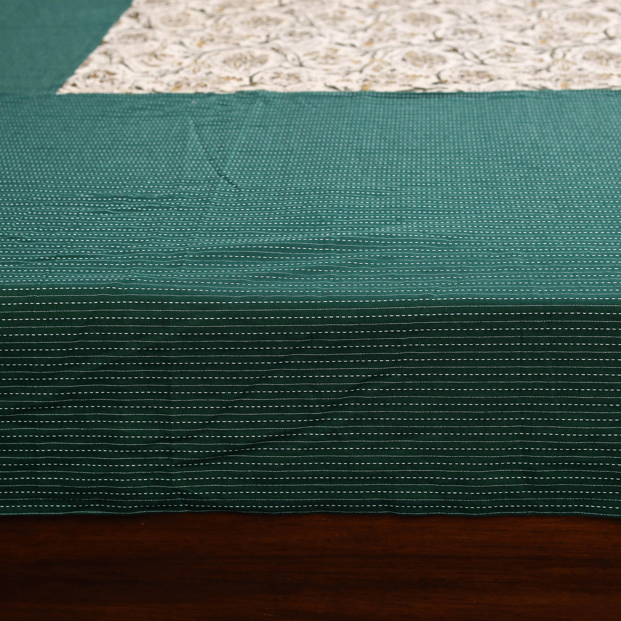 This green cotton bedsheet set features a beautiful blend of kantha stitching with kalamkari block-printed patches, showcasing traditional artistry with a modern touch. Made from breathable cotton, it ensures comfort and long-lasting use. The detailed design adds a handcrafted charm to your space. The set includes one double bedsheet and two matching pillow covers, making it perfect for enhancing your home decor.