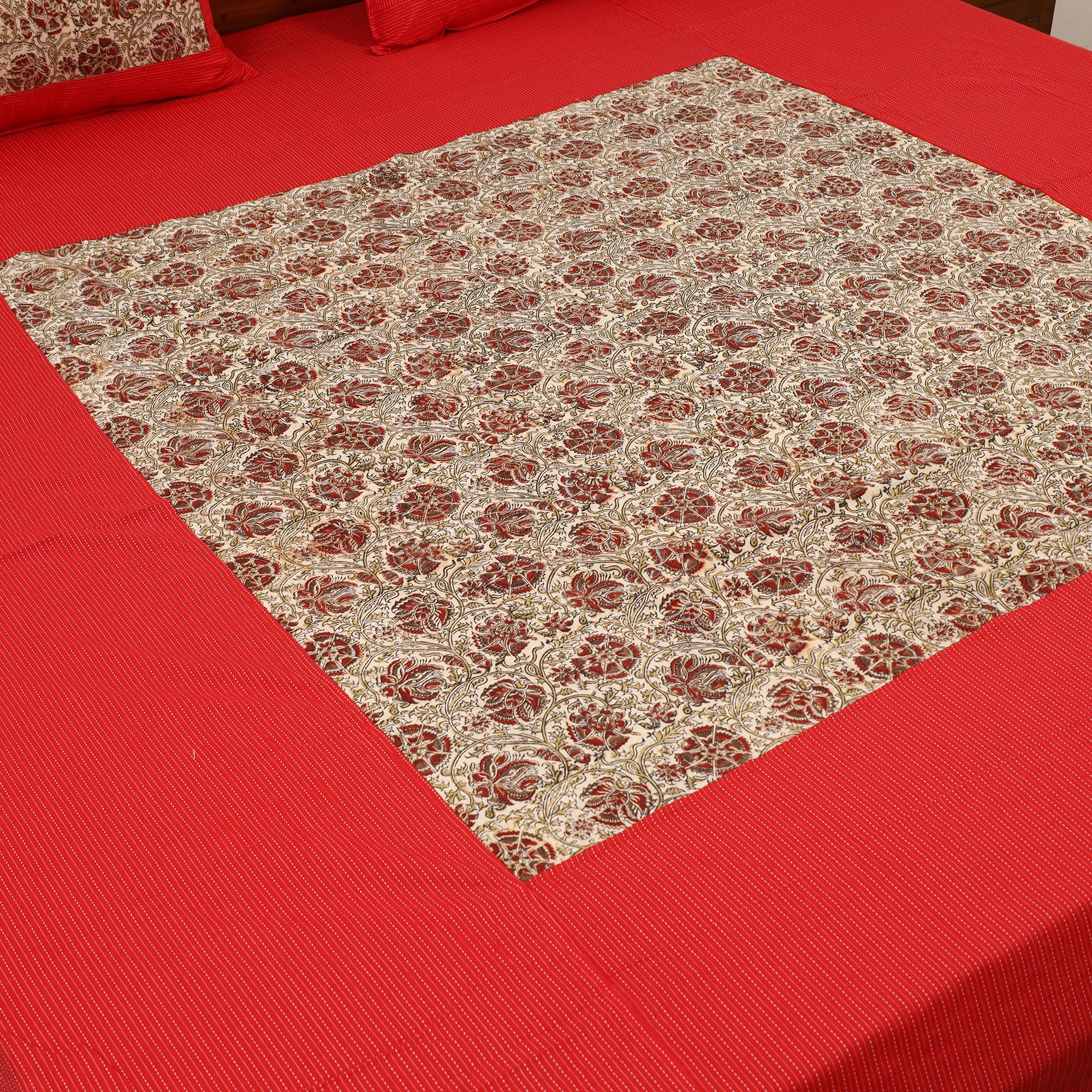This red cotton bedsheet set features a beautiful blend of kantha stitching with kalamkari block-printed patches, showcasing traditional artistry with a modern touch. Made from breathable cotton, it ensures comfort and long-lasting use. The detailed design adds a handcrafted charm to your space. The set includes one double bedsheet and two matching pillow covers, making it perfect for enhancing your home décor.