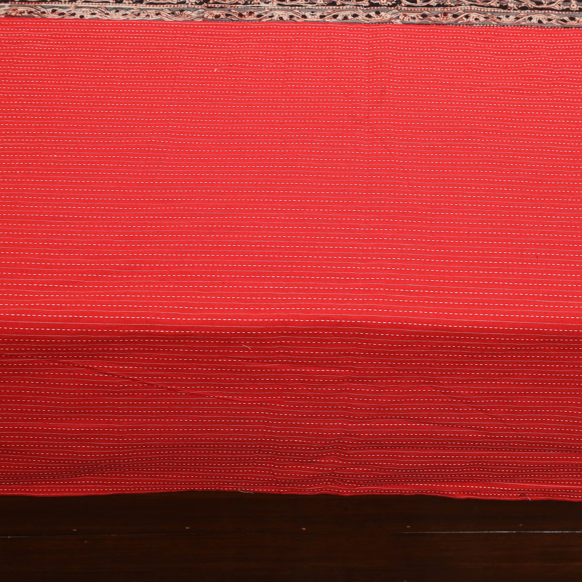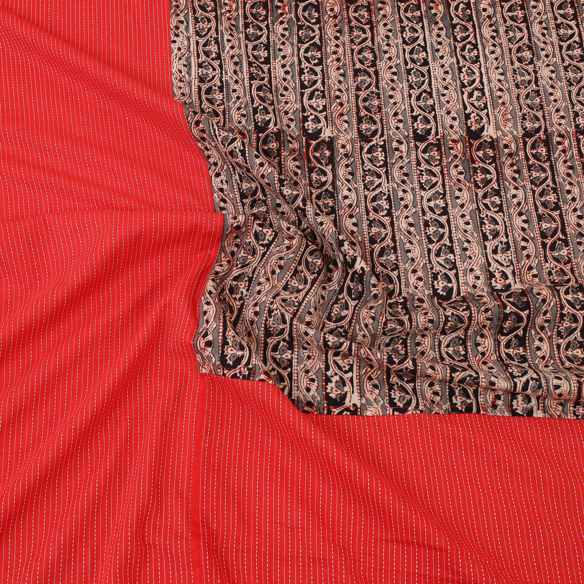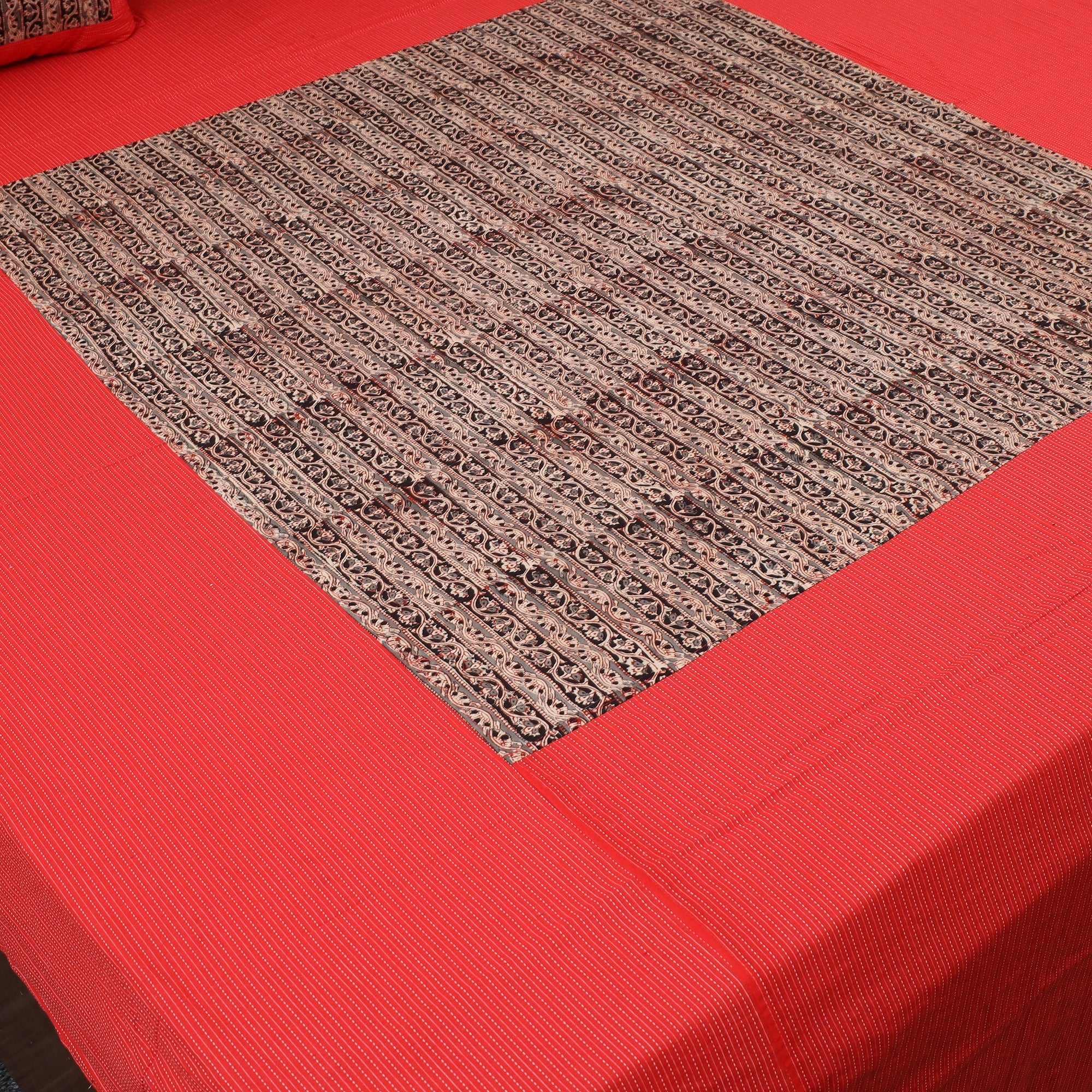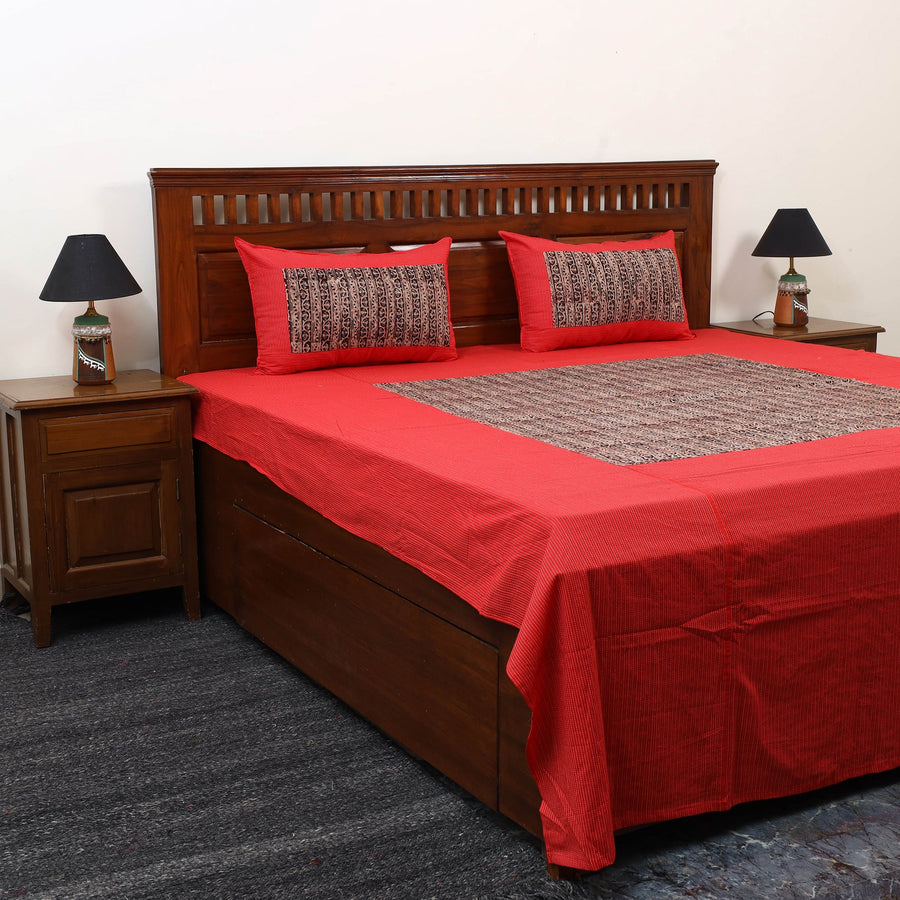 This red cotton bedsheet set features a beautiful blend of kantha stitching with kalamkari block-printed patches, showcasing traditional artistry with a modern touch. Made from breathable cotton, it ensures comfort and long-lasting use. The detailed design adds a handcrafted charm to your space. The set includes one double bedsheet and two matching pillow covers, making it perfect for enhancing your home décor.