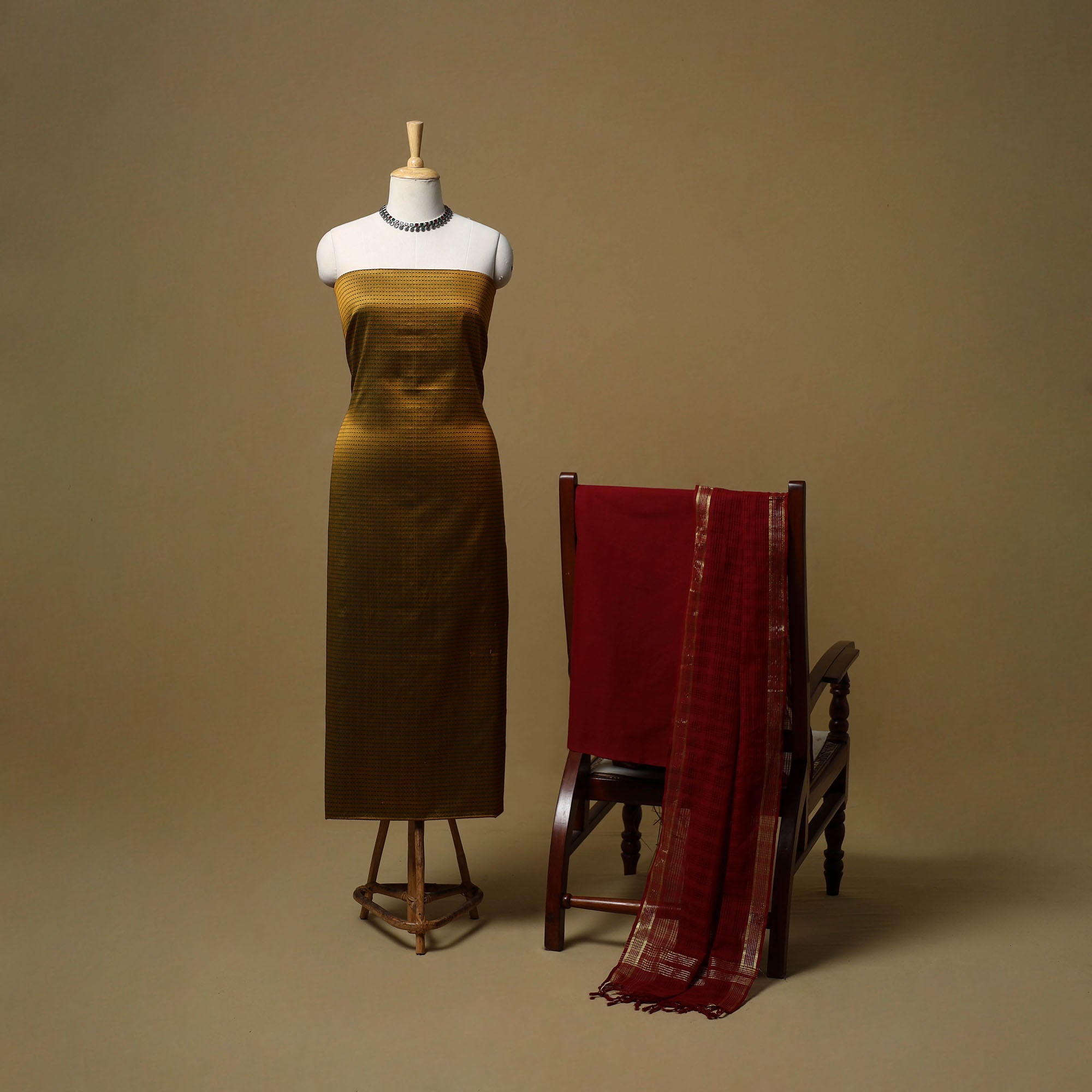 Khun cotton unstitched dress material from Karnataka beautifully showcases the region’s traditional weaving style and is considered thousands of years old. The 3pc set includes a woven kurta fabric, a dupatta with a missing check pattern and zari border and a plain bottom. Known for its bright colours and soft texture, khun fabric adds a special charm, making it ideal for both everyday wear and occasional outfits.