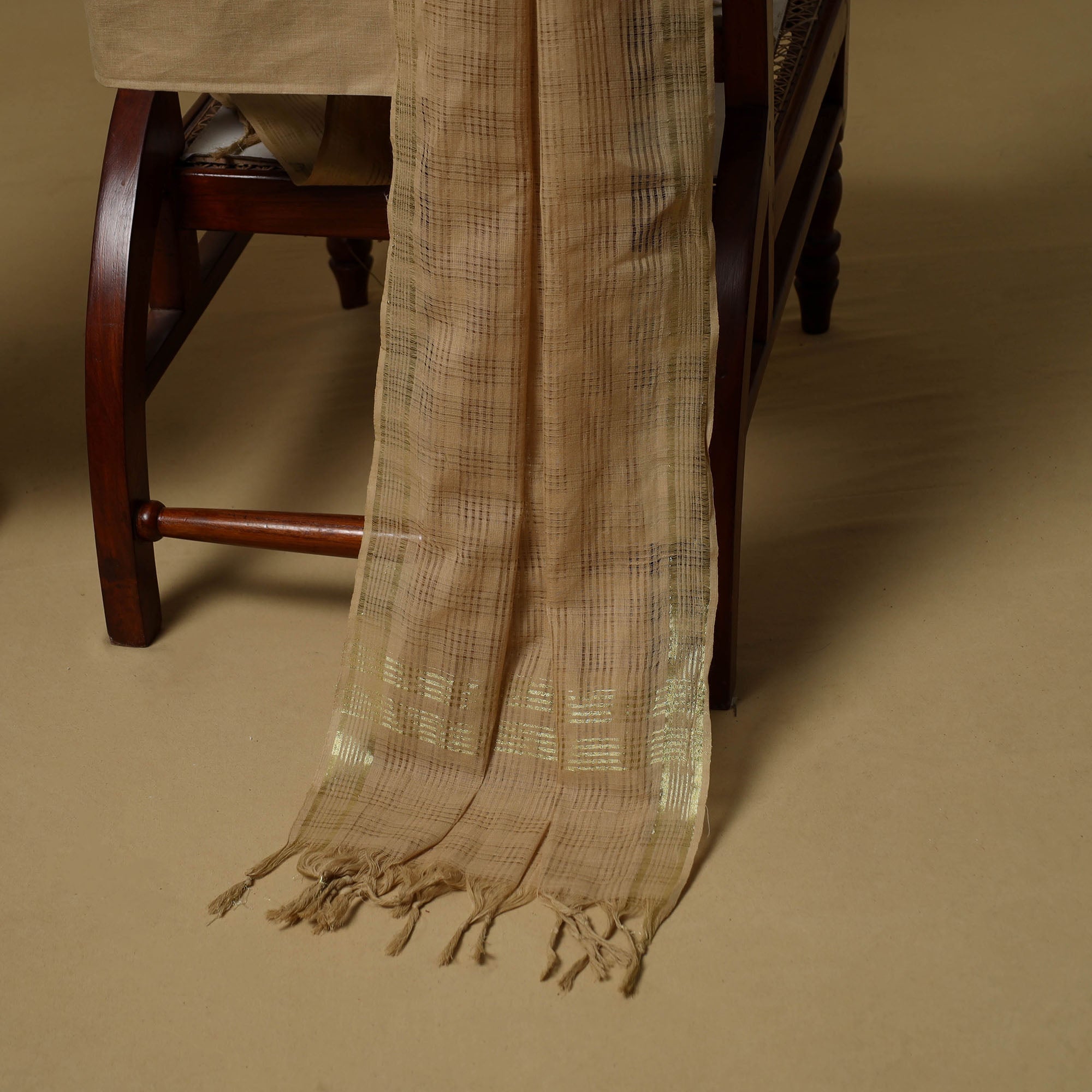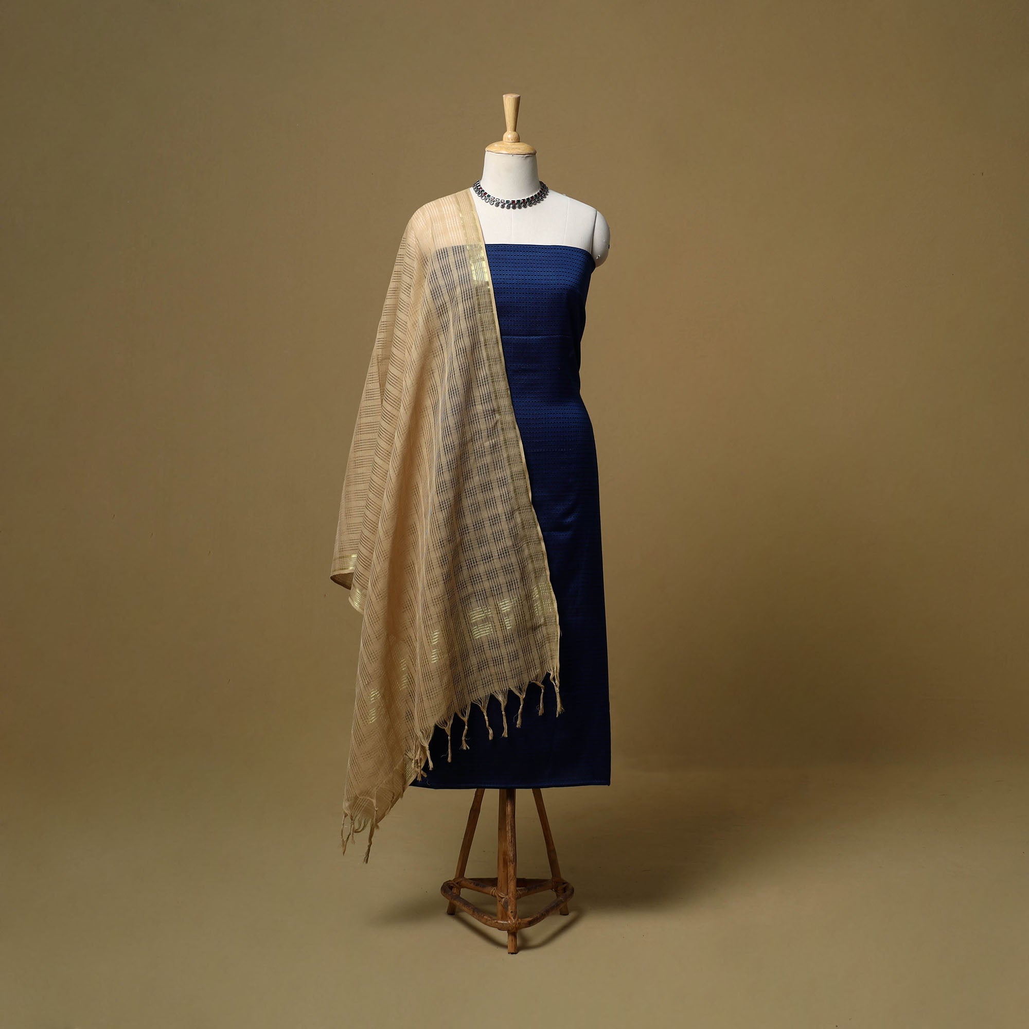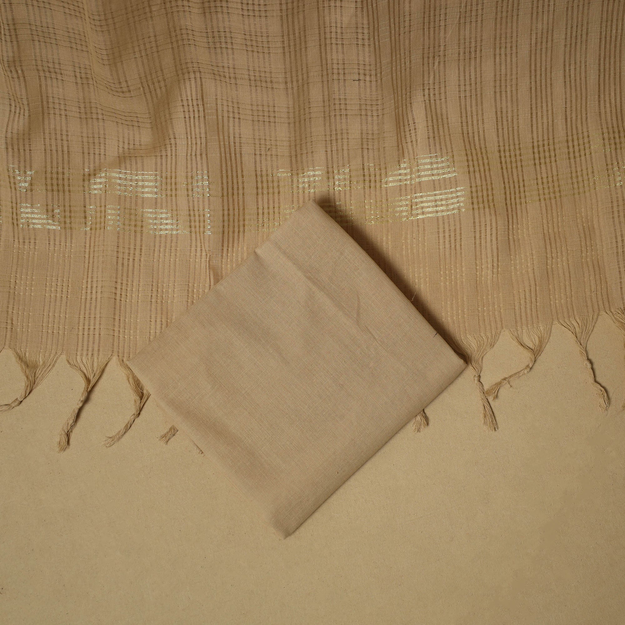 Khun cotton unstitched dress material from Karnataka beautifully showcases the region’s traditional weaving style and is considered thousands of years old. The 3pc set includes a woven kurta fabric, a dupatta with a missing check pattern and zari border and a plain bottom. Known for its bright colours and soft texture, khun fabric adds a special charm, making it ideal for both everyday wear and occasional outfits.