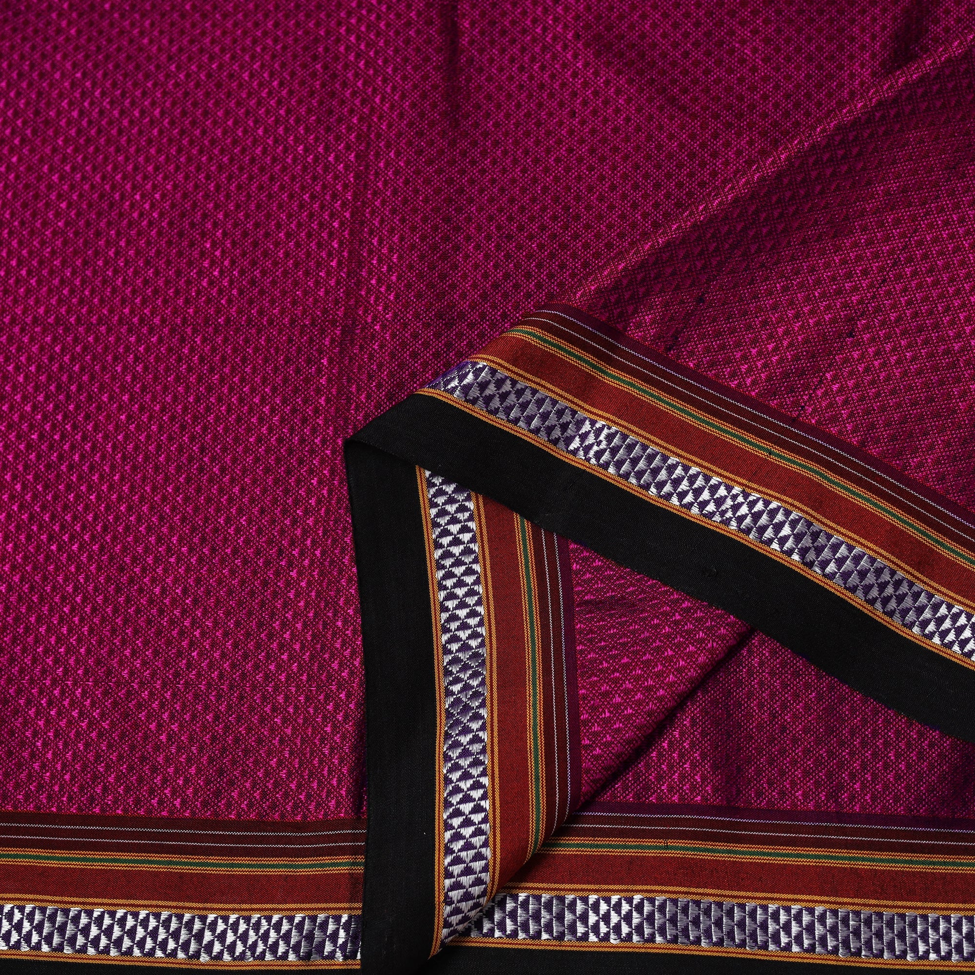 Khun is woven exclusively on a loom in Guledagudd, Bagalkot region, Karnataka. Used only for sari blouses, this handmade fabric is easily recognizable by its small white intricate motif and distinctive reddish-purple border.