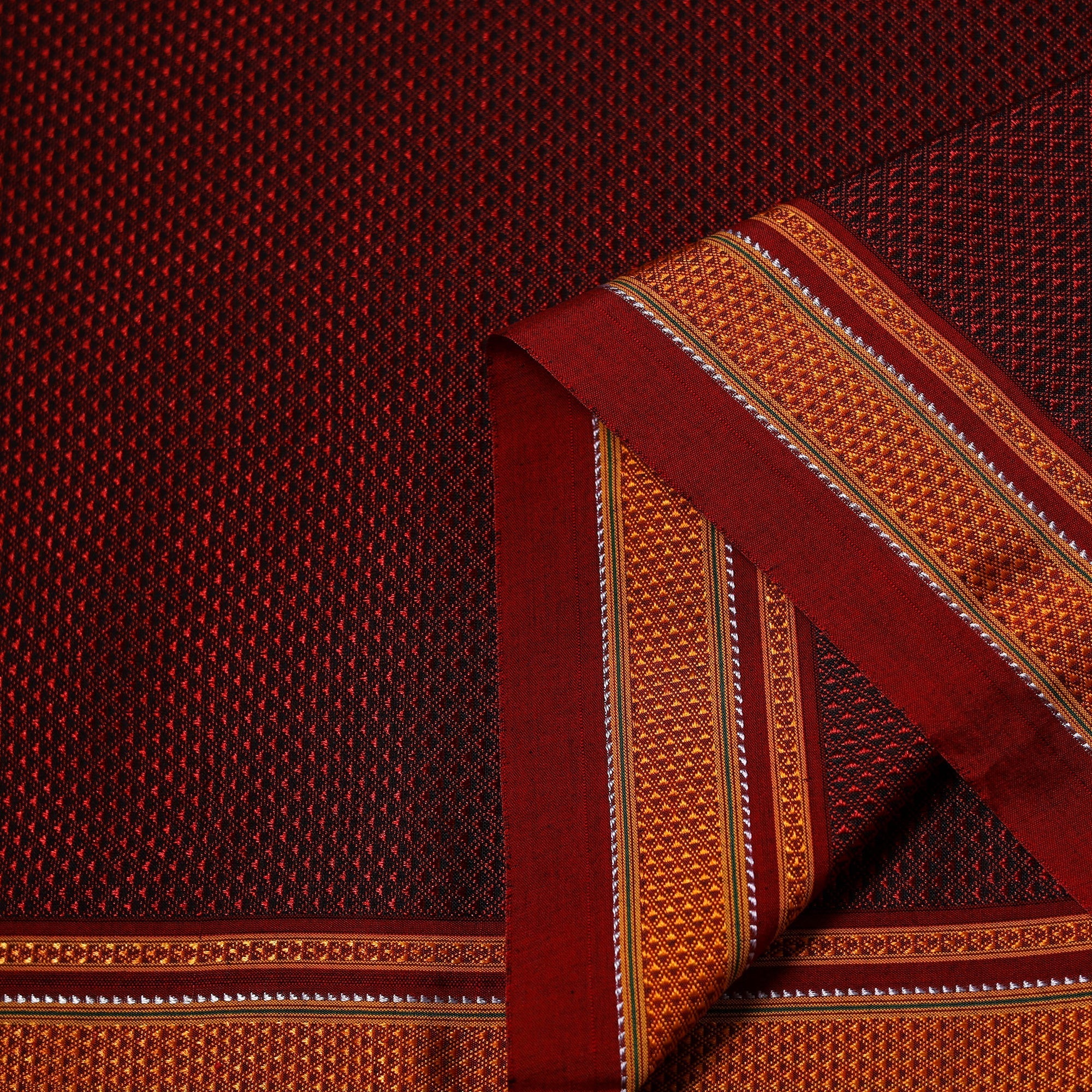 Khun is woven exclusively on a loom in Guledagudd, Bagalkot region, Karnataka. Used only for sari blouses, this handmade fabric is easily recognizable by its small white intricate motif and distinctive reddish-purple border.