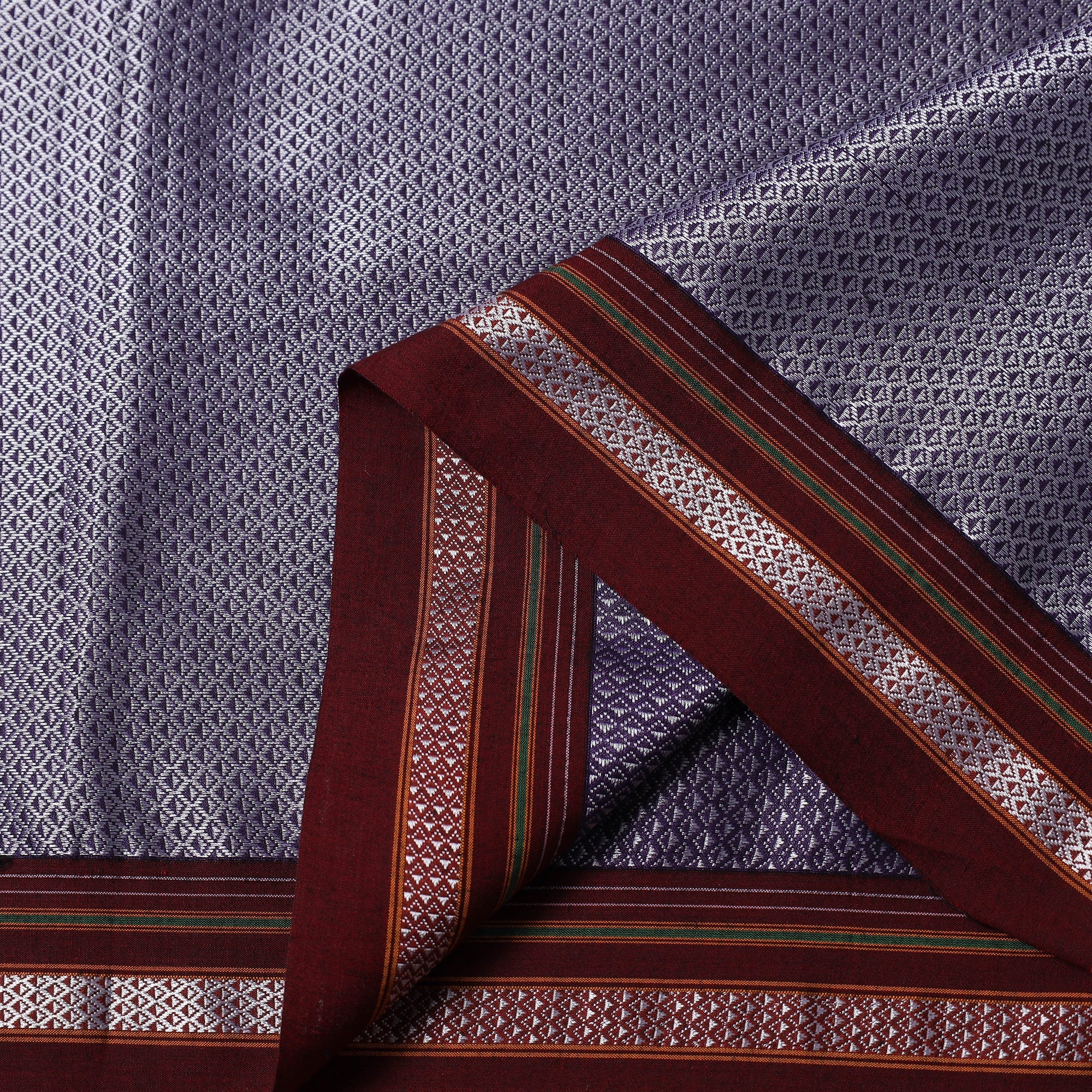 Khun is woven exclusively on a loom in Guledagudd, Bagalkot region, Karnataka. Used only for sari blouses, this handmade fabric is easily recognizable by its small white intricate motif and distinctive reddish-purple border.