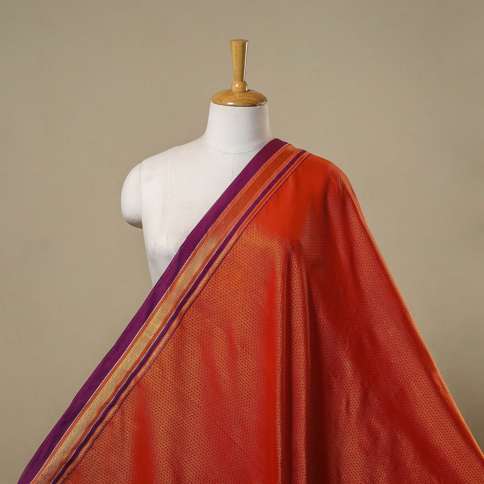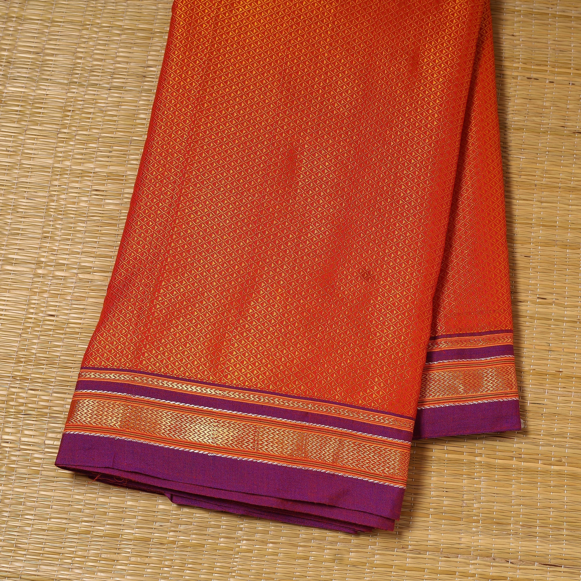 Orange khun cotton fabric is a traditional weave from Karnataka and is considered thousands of years old, making it one of India’s oldest textile traditions. Known for its unique texture and vibrant sheen, Khun fabric is used to make sarees, blouses, kurtas, and other garments.