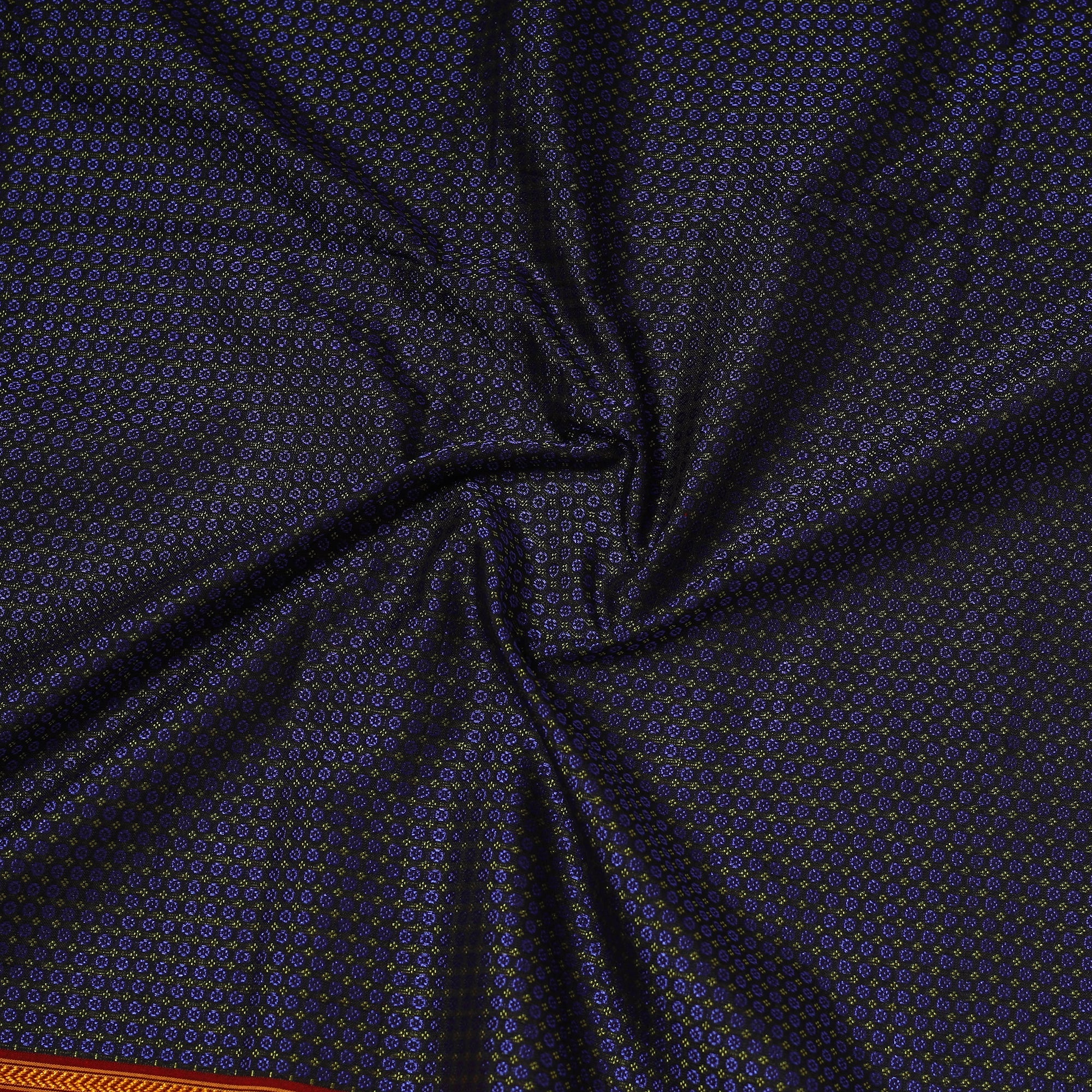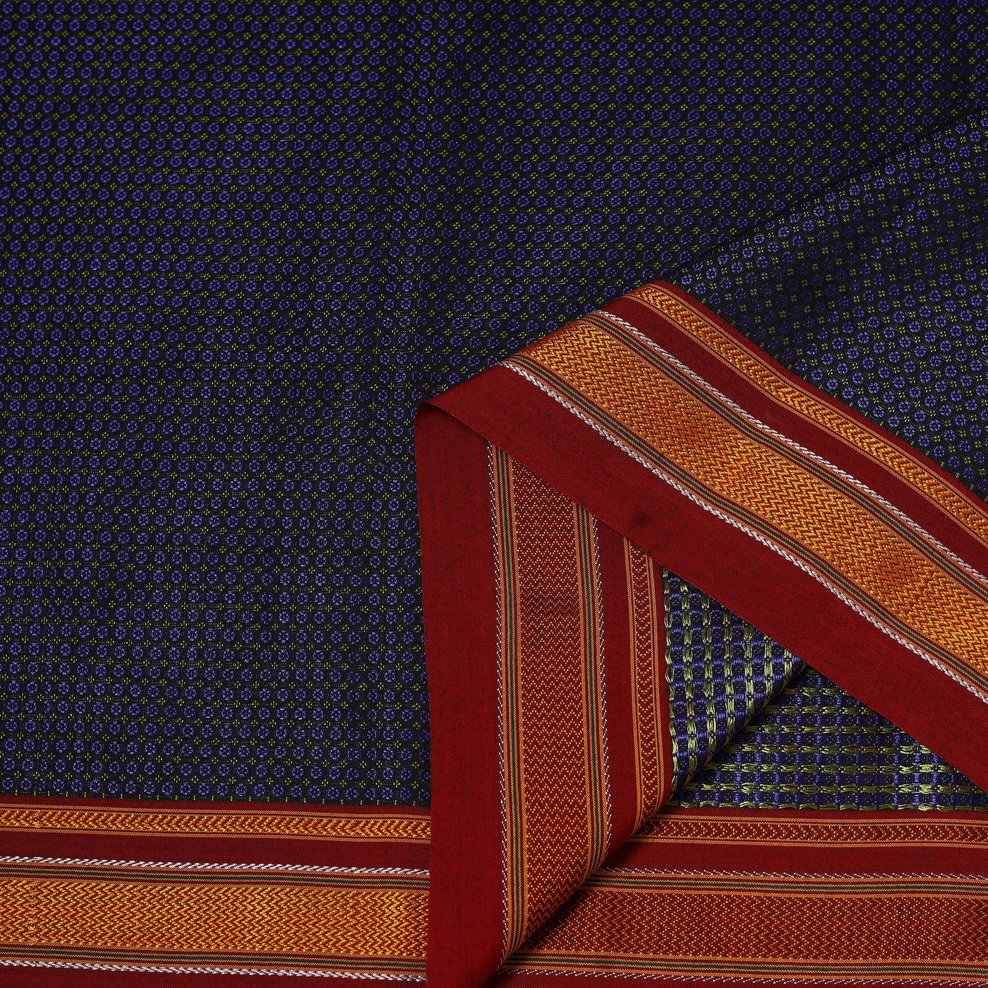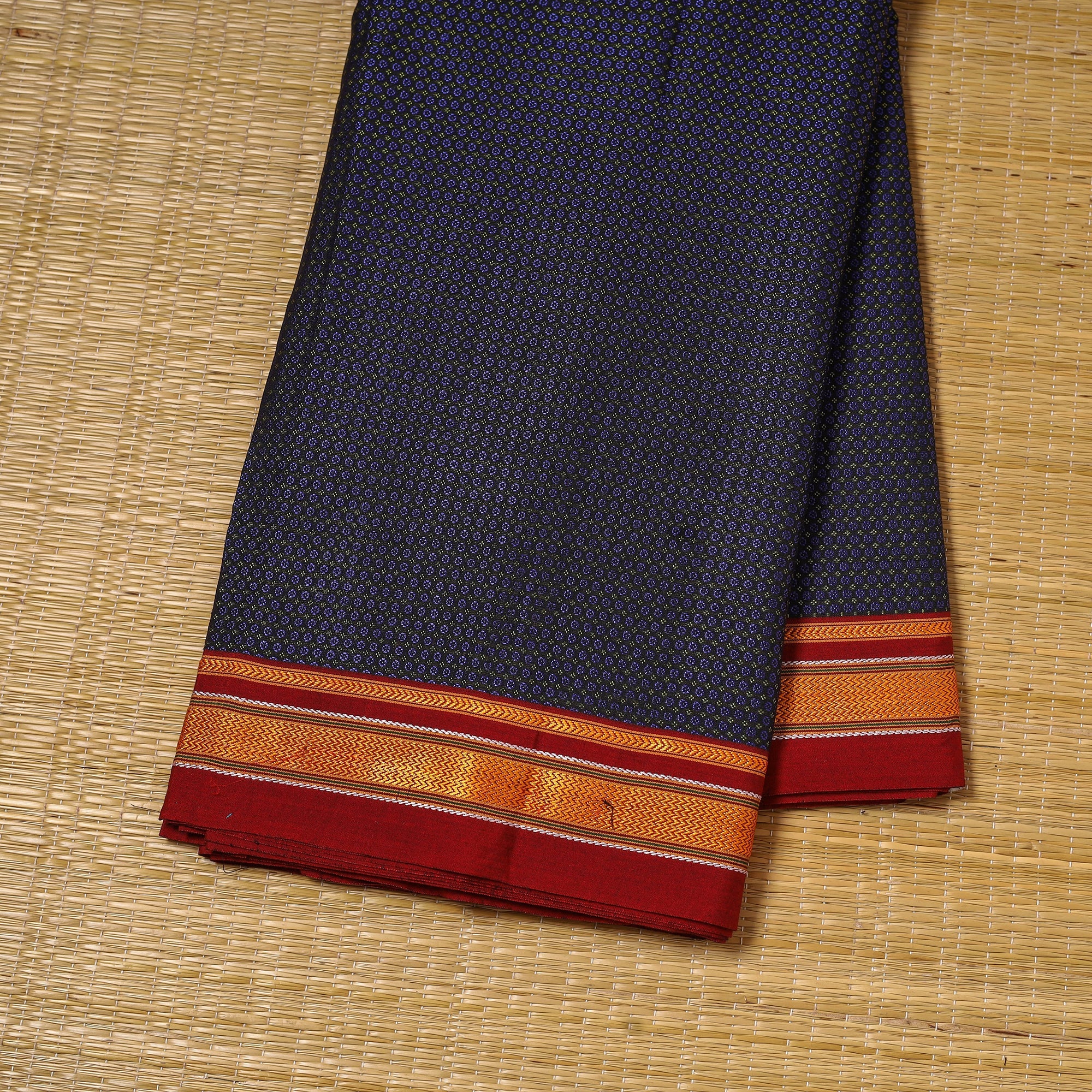 Khun is woven exclusively on a loom in Guledagudd, Bagalkot region, Karnataka. Used only for sari blouses, this handmade fabric is easily recognizable by its small white intricate motif and distinctive reddish-purple border.