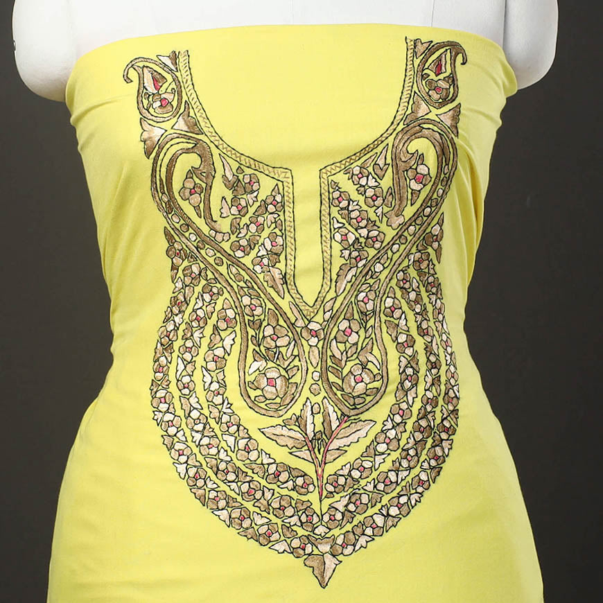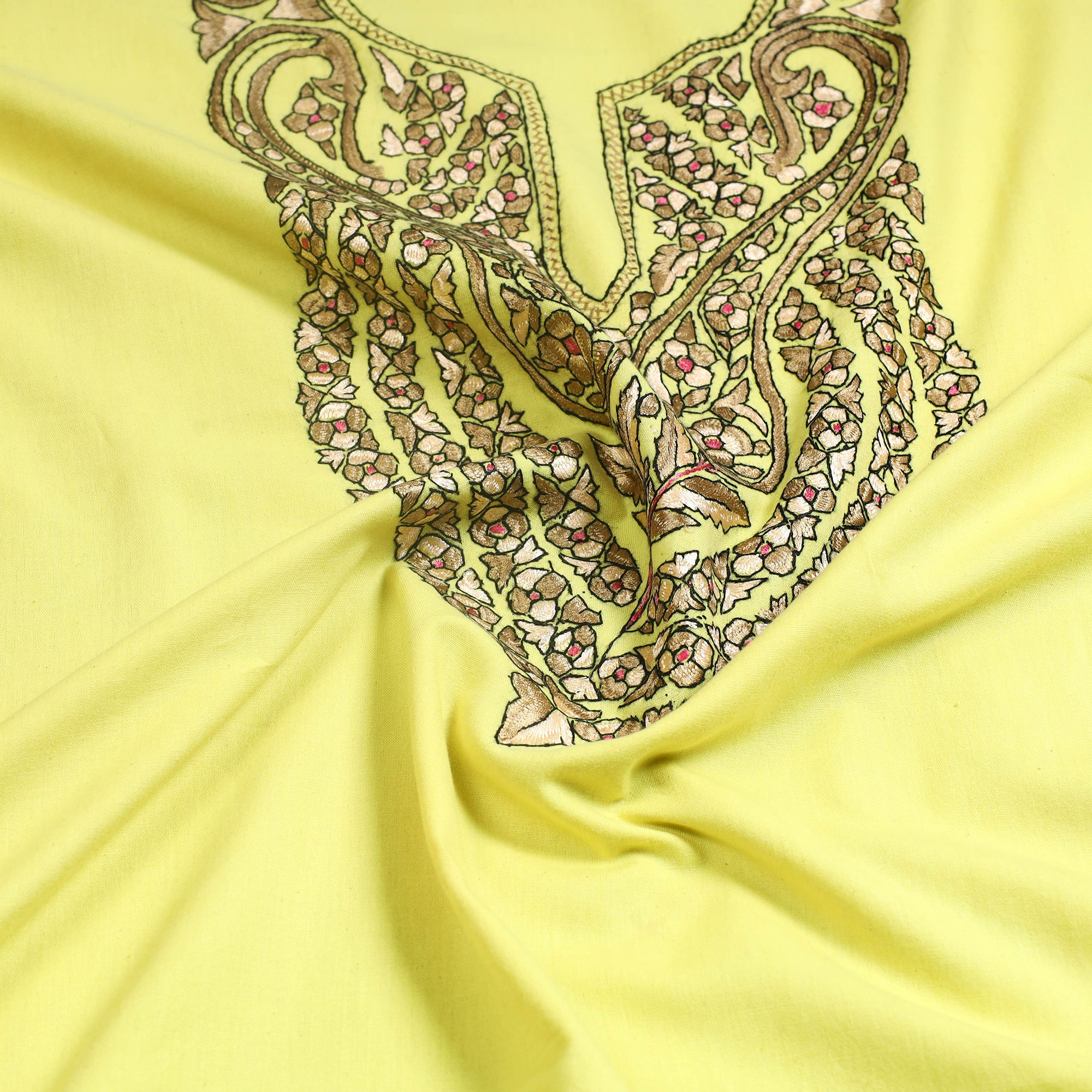 Embrace the beauty of Kashmir with this yellow kashida hand embroidery cambric cotton kurta material by Zahoor Ahmed. This kurta material features vibrant, intricate designs made using traditional kashidakari techniques, each piece reflects the rich heritage of Kashmir. This kurta material, crafted by skilled artisans, is perfect for creating elegant, unique outfits that stand out. Discover the elegance of this art form and support local craftsmanship.