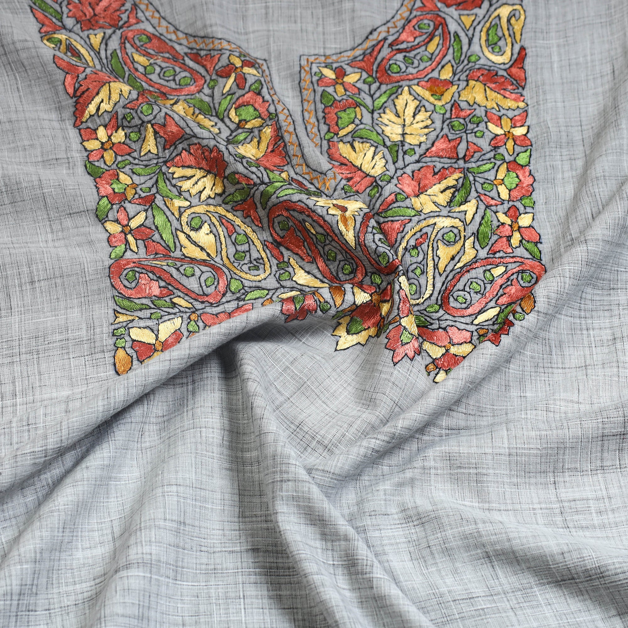 Embrace the beauty of kashmir with this grey kashida hand embroidery cotton kurta material by Zahoor Ahmed. This kurta material features vibrant, intricate designs made using traditional Kashidakari techniques, each piece reflects the rich heritage of Kashmir. This kurta material, crafted by skilled artisans, is perfect for creating elegant, unique outfits that stand out. Discover the elegance of this art form and support local craftsmanship.