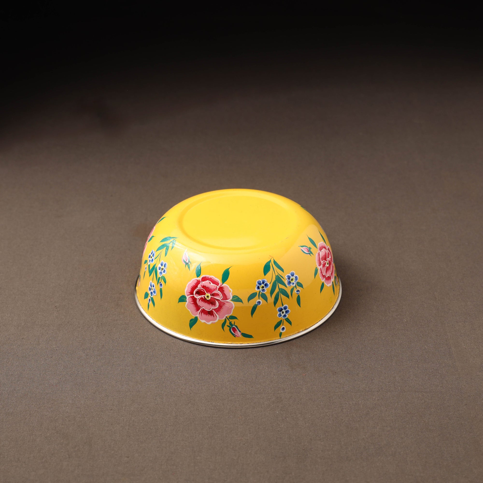 This yellow handpainted floral motifs breakfast bowl created by artisans in Kashmir. Made on a sturdy stainless steel base and painted with waterproof, oil-based colours for long-lasting use. The bowl is ideal for serving breakfast, snacks or side dishes and its smooth enamel coating adds a vibrant finish while making it easy to clean and maintain.