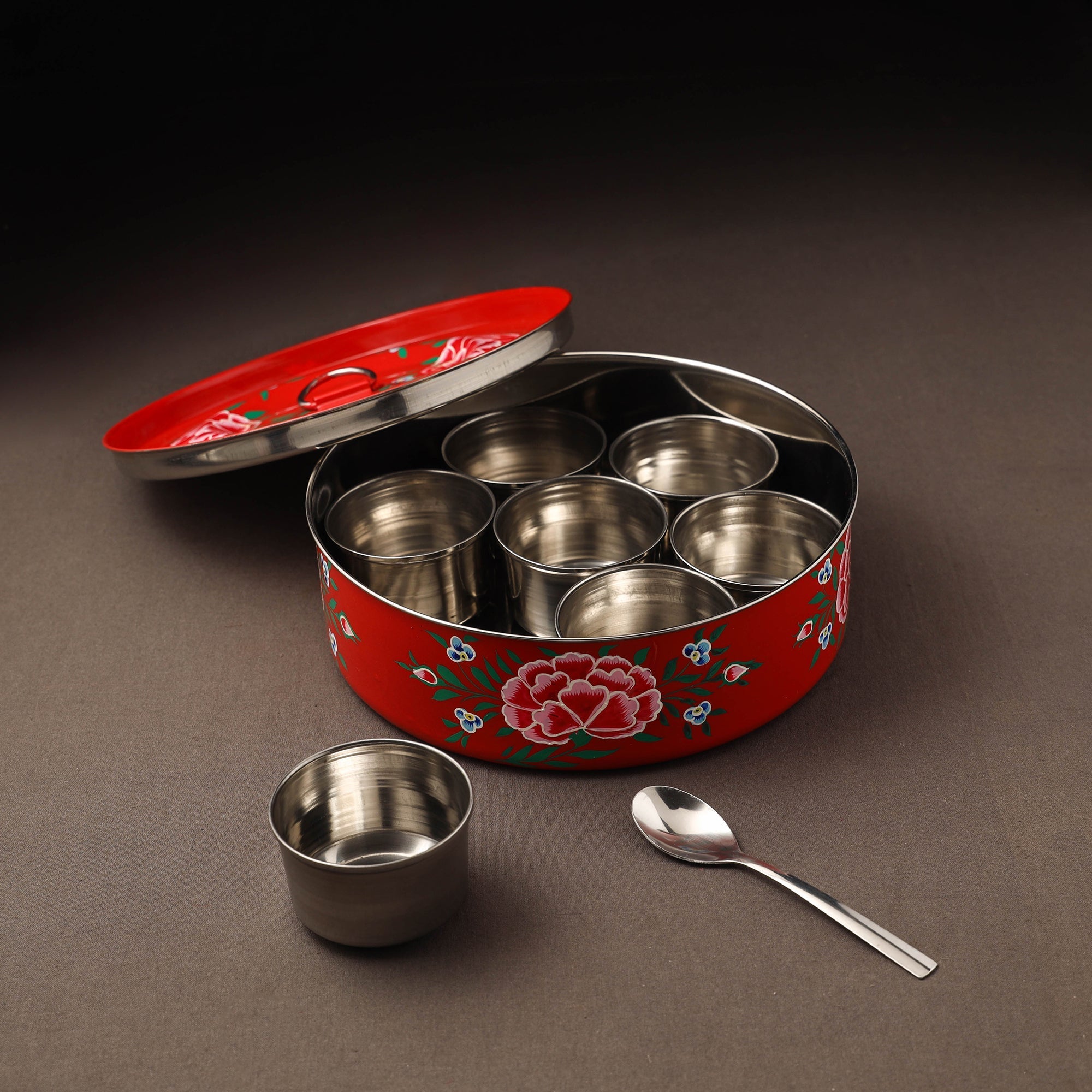 This red handpainted floral motifs masala box created by artisans in Kashmir. Made on a sturdy stainless steel base and painted with waterproof, oil-based colours for long-lasting use. It has an inner steel lid with seven small masala containers for spices and one small spoon inside. The smooth enamel coating adds a vibrant finish while making it easy to clean and maintain.