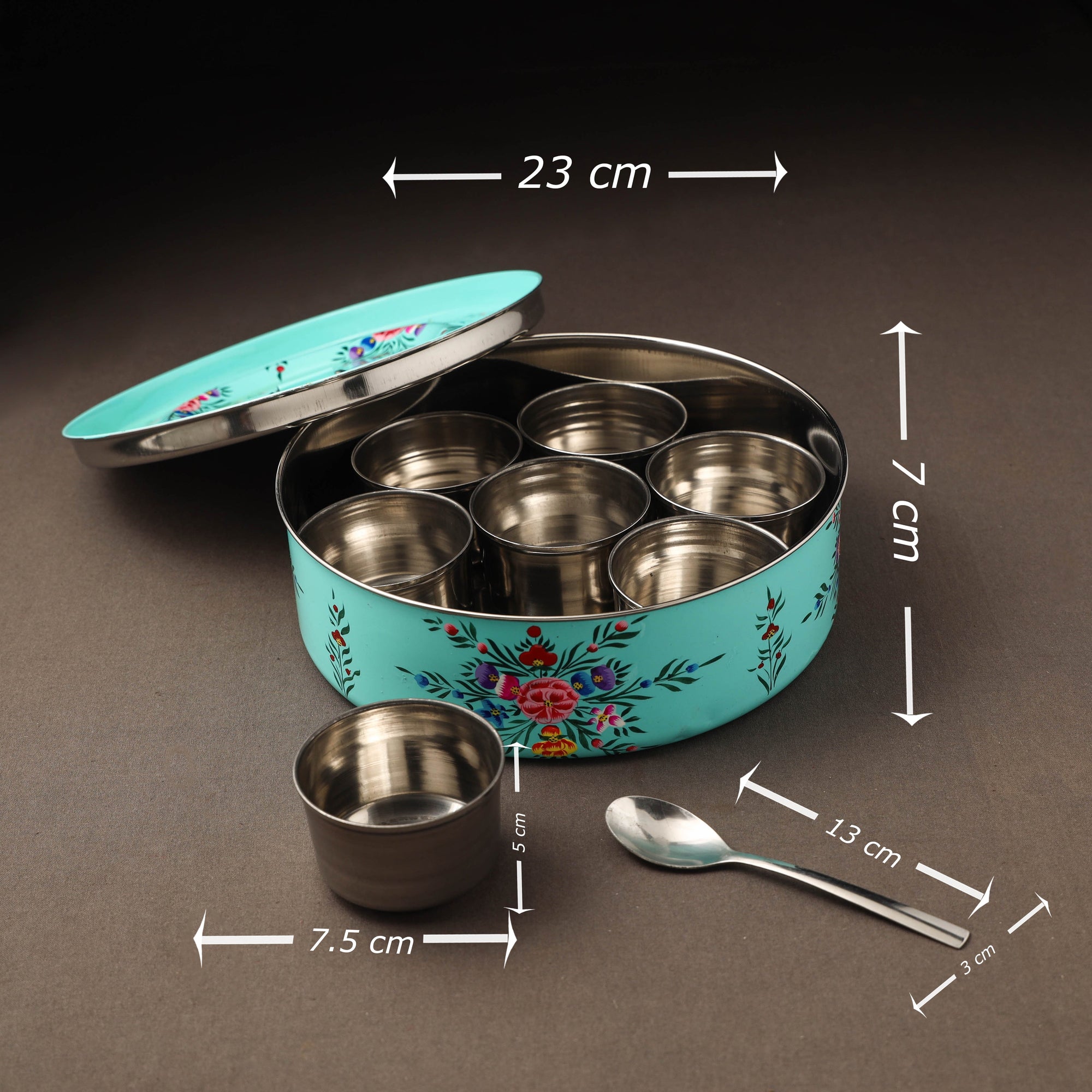 Spoon : Length - 13 cm, Width - 3 cm. (It has inner steel lid with seven small masala containers & one small spoon inside).