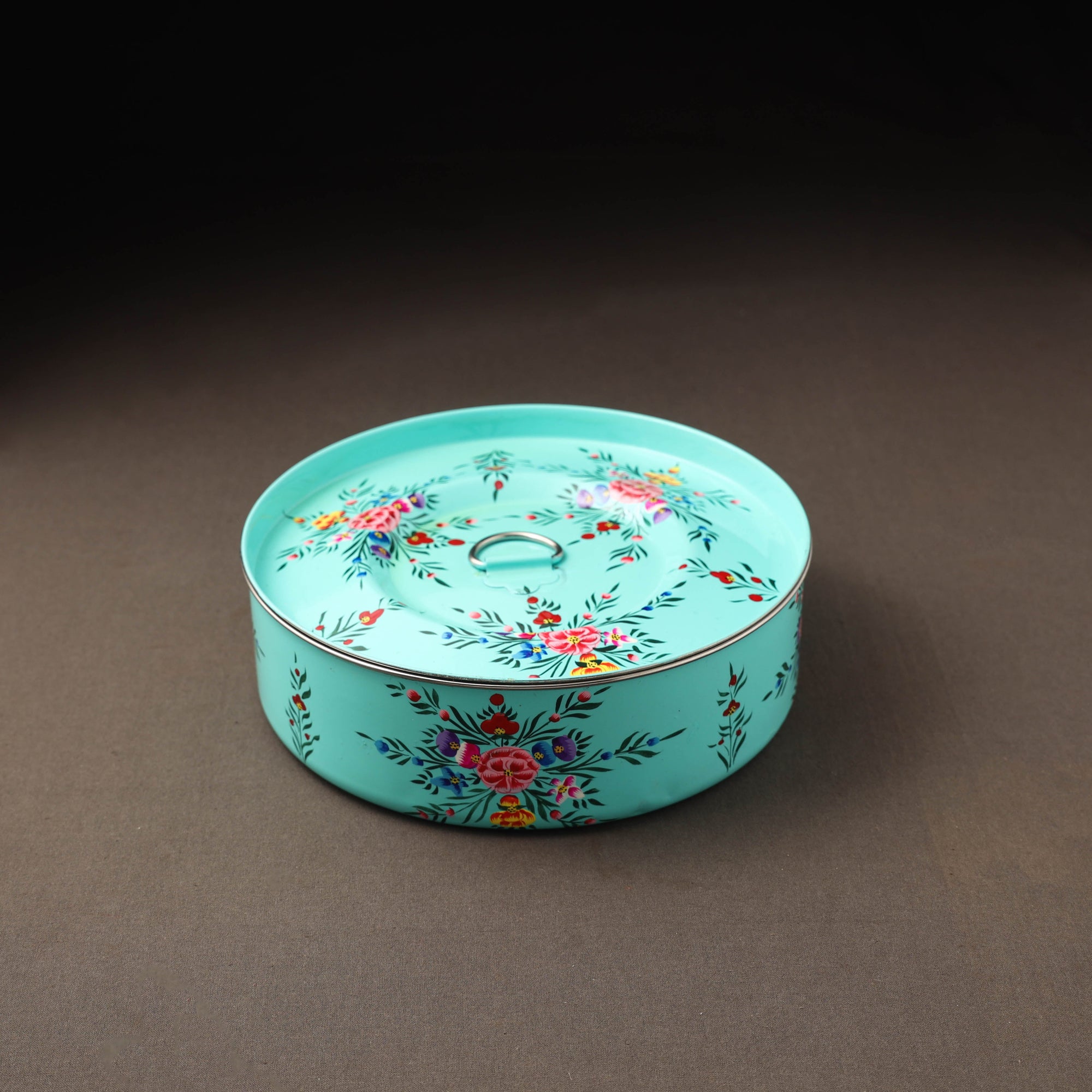 This blue handpainted floral motifs masala box created by artisans in Kashmir. Made on a sturdy stainless steel base and painted with waterproof, oil-based colours for long-lasting use. It has an inner steel lid with seven small masala containers for spices and one small spoon inside. The smooth enamel coating adds a vibrant finish while making it easy to clean and maintain.