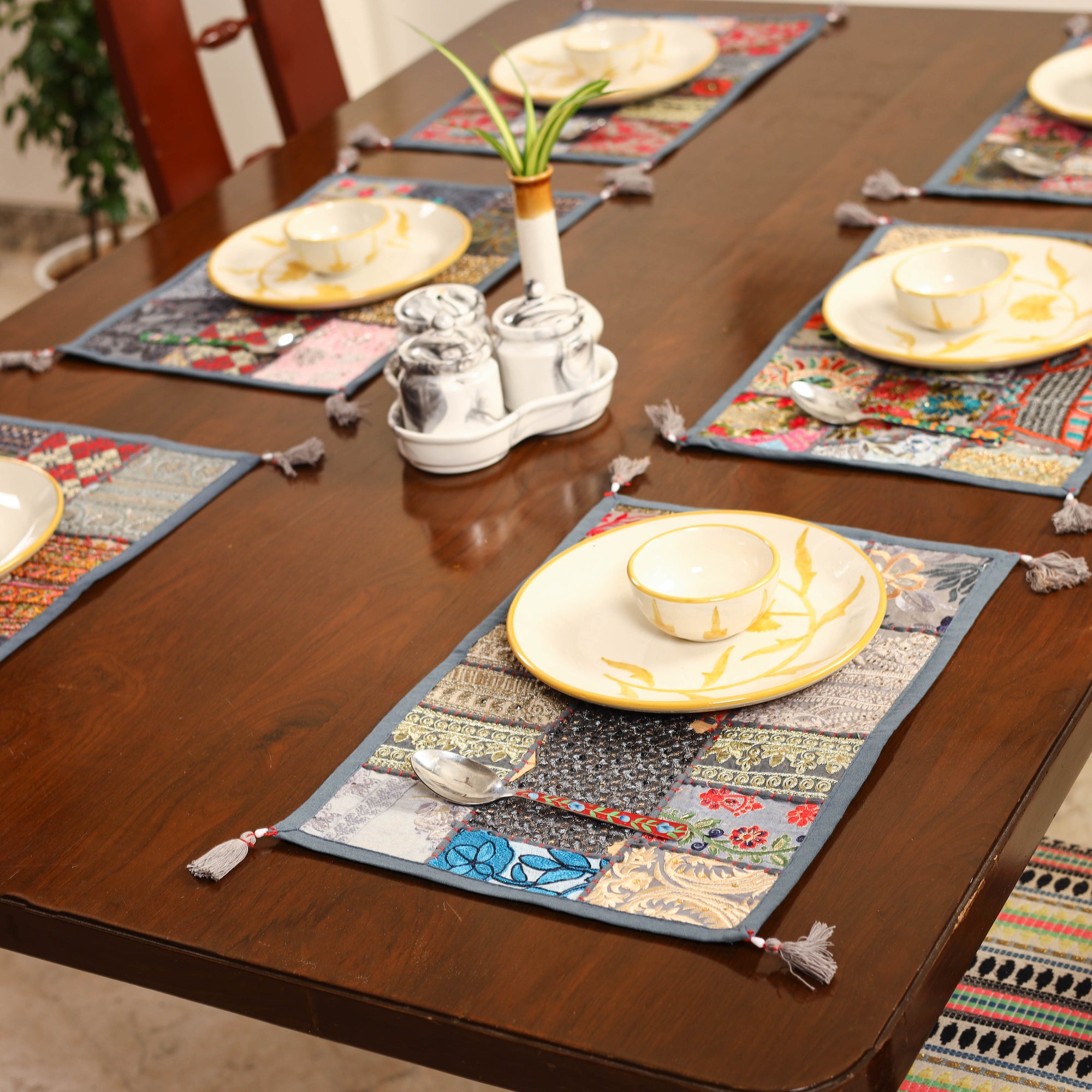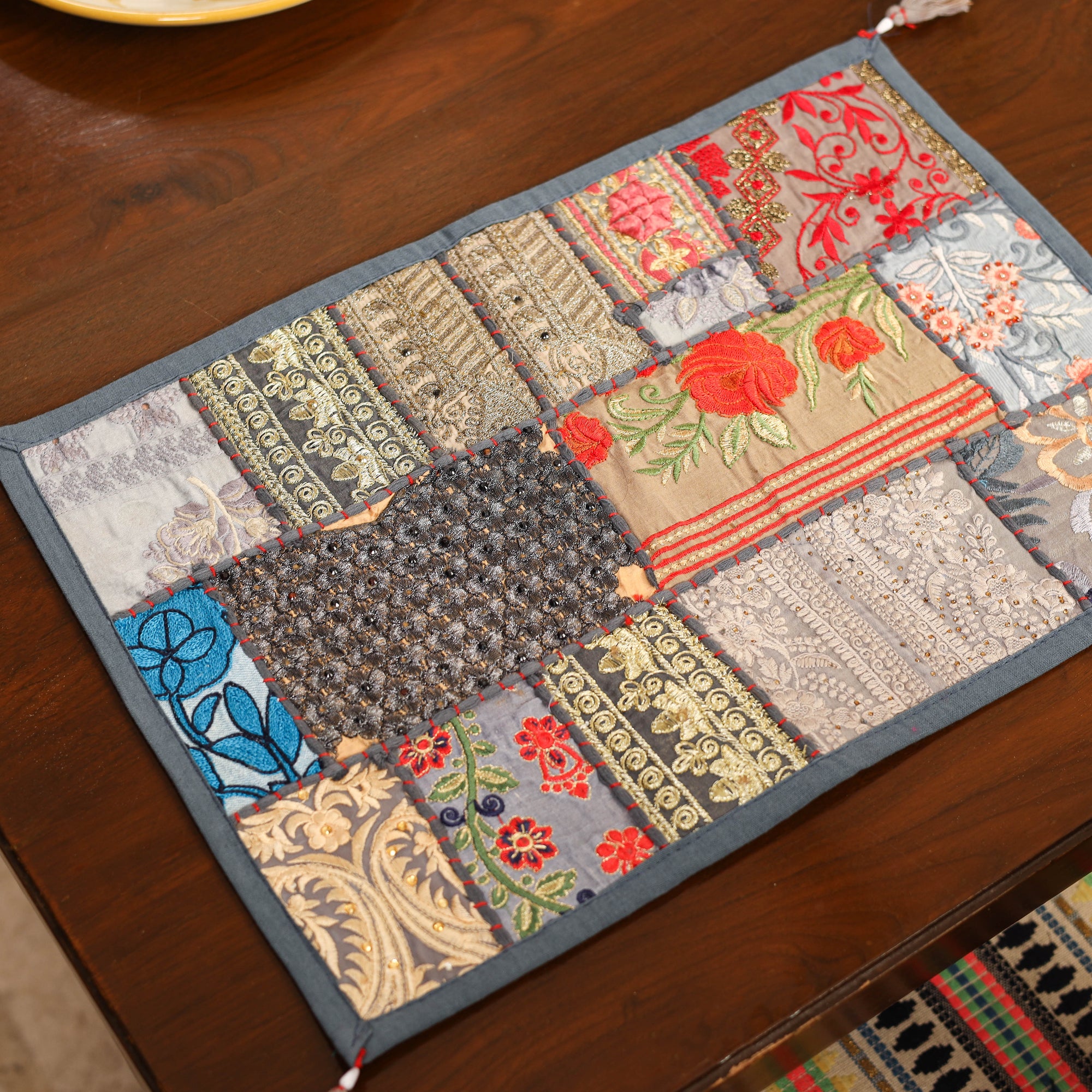 Add a touch of Rajasthani charm to your dining space with this grey Khambadiya patchwork cotton mat from Barmer. Its lively fabric patches paired with detailed embroidery create a beautiful fusion of tradition and utility. The cotton lining at the back enhances durability and safeguards your table. A perfect mix of elegance and practicality, ideal for adding a cultural touch to any dining space.