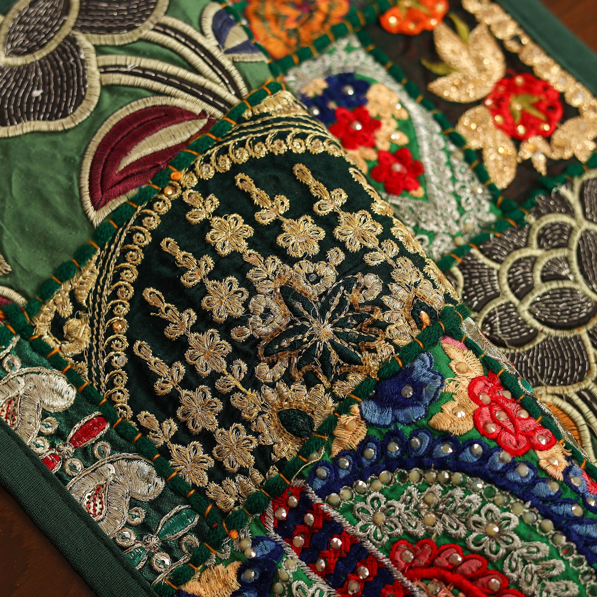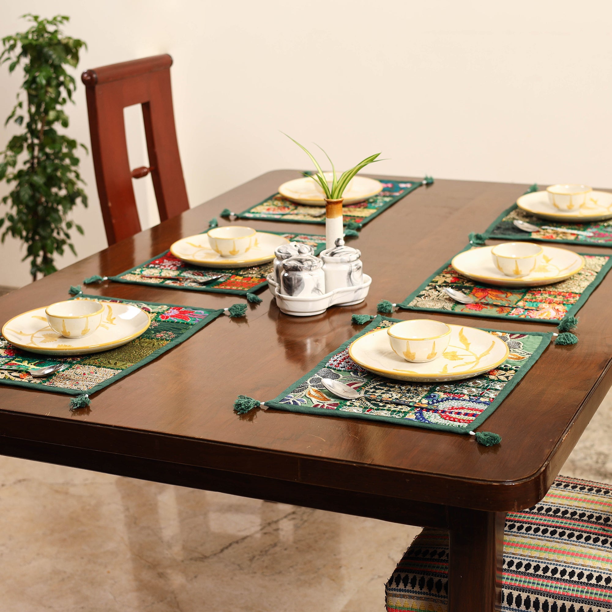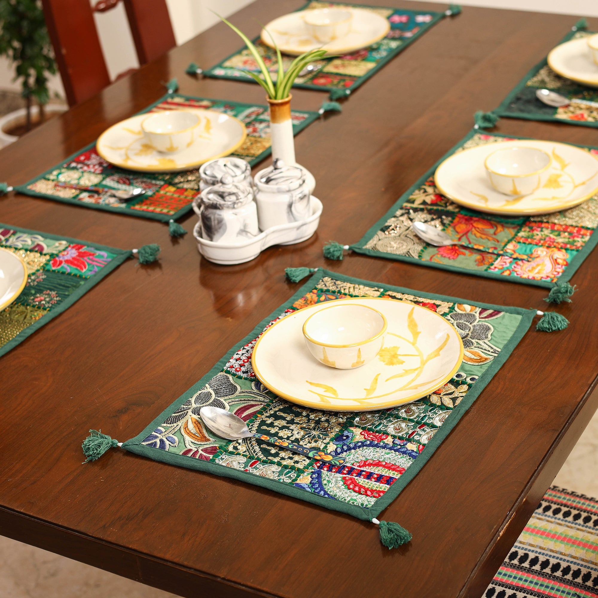 Add a touch of Rajasthani charm to your dining space with this green Khambadiya patchwork cotton mat from Barmer. Its lively fabric patches paired with detailed embroidery create a beautiful fusion of tradition and utility. The cotton lining at the back enhances durability and safeguards your table. A perfect mix of elegance and practicality, ideal for adding a cultural touch to any dining space.