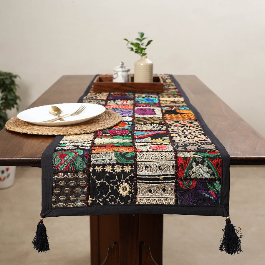 Handcrafted khambadiya patchwork table runner crafted by artisans in Barmer, Rajasthan. This runner features intricate embroidery combining beauty and function. The thick cotton lining on the back ensures durability while protecting the delicate front design. Perfect for both special occasions and everyday use, It brings a touch of rich culture to your dining setting.