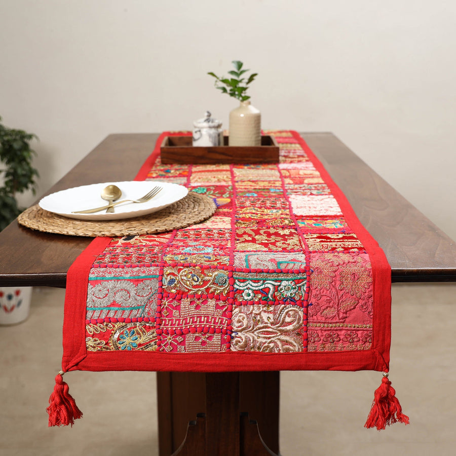 Handcrafted red khambadiya patchwork table runner crafted by artisans in Barmer, Rajasthan. This runner features intricate embroidery combining beauty and function. The thick cotton lining on the back ensures durability while protecting the delicate front design. Perfect for both special occasions and everyday use, It brings a touch of rich culture to your dining setting.