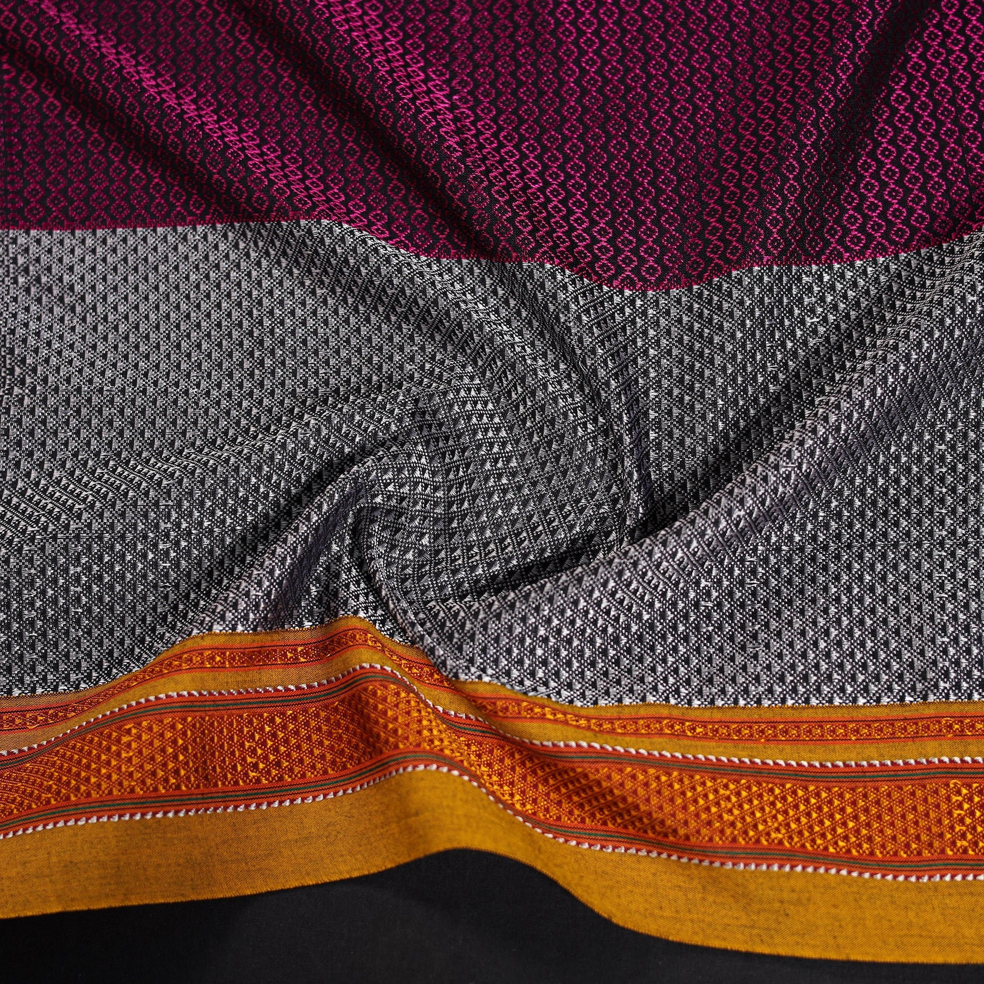 Khun is woven exclusively on a loom in Guledagudd, Bagalkot region, Karnataka. Used only for sari blouses, this handmade fabric is easily recognizable by its small white intricate motif and distinctive reddish-purple border.