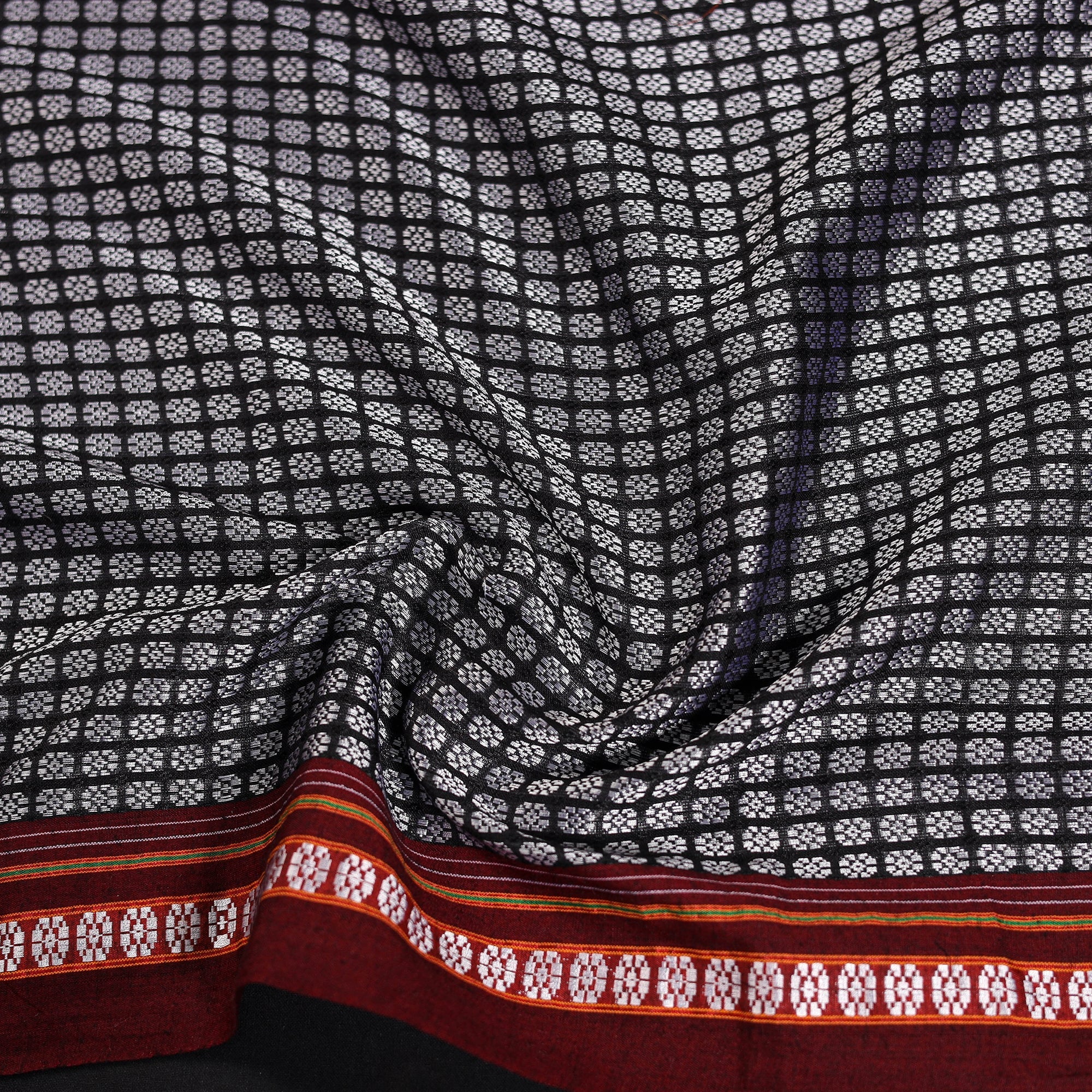 Khun is woven exclusively on a loom in Guledagudd, Bagalkot region, Karnataka. Used only for sari blouses, this handmade fabric is easily recognizable by its small white intricate motif and distinctive reddish-purple border.