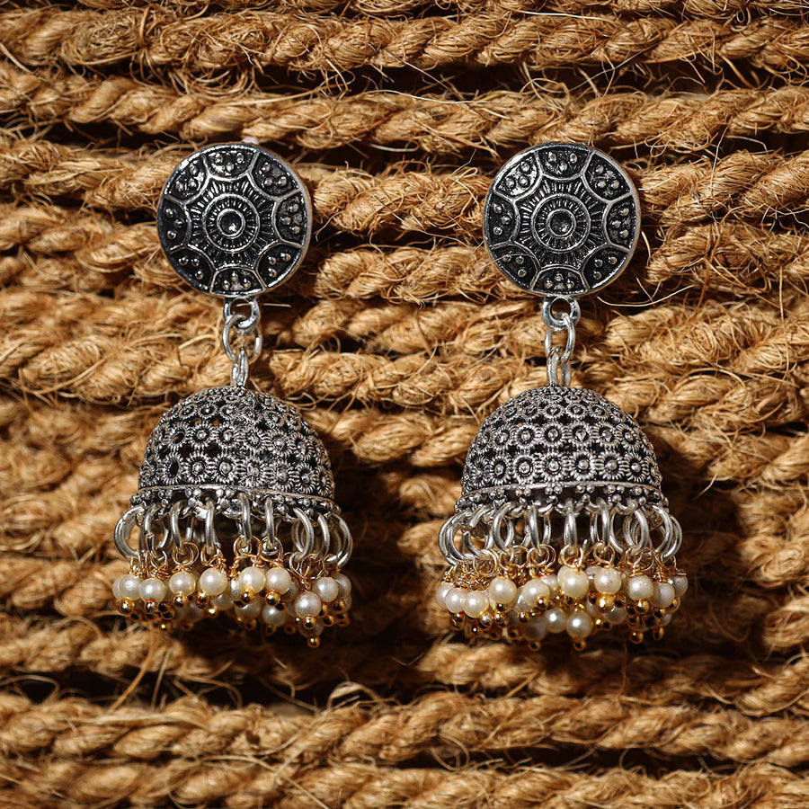 Grey handcrafted gs beaded jhumki earrings. Crafted from oxidised german silver adorned with intricate bead work. Perfect for casual outings or festive celebrations they make a versatile addition to any jewelry collection.
