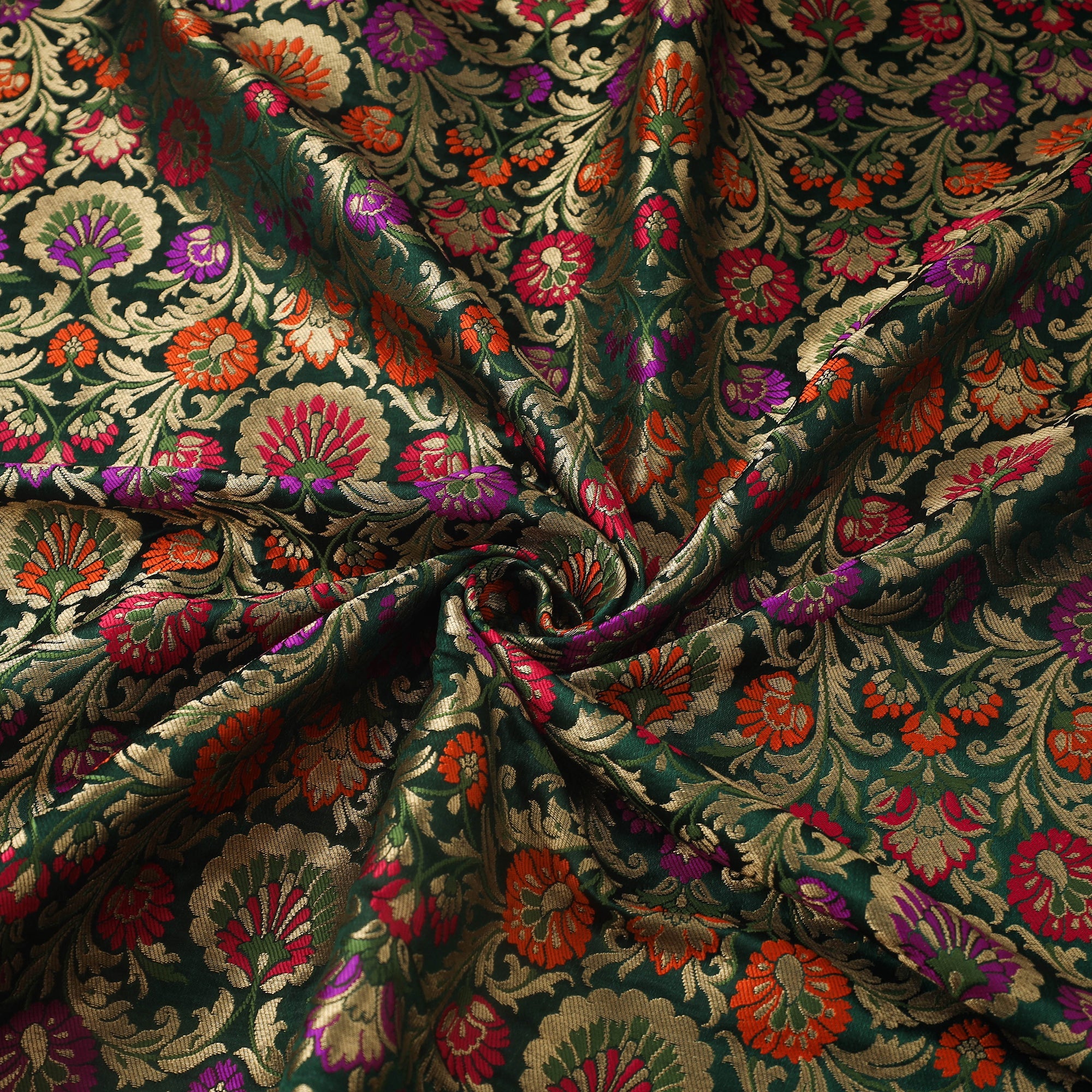 Experience the elegance of art silk zari green kimkhab banarasi brocade fabric. Known as kimkhwab (or kinkhab), meaning ‘golden dream’, this exquisite fabric is crafted from a rich blend of art silk and semi-katan, adorned with intricate golden zari weaving. A masterpiece from Varanasi, it exudes opulence, making it perfect for sarees, lehengas, dupattas, and regal upholstery.