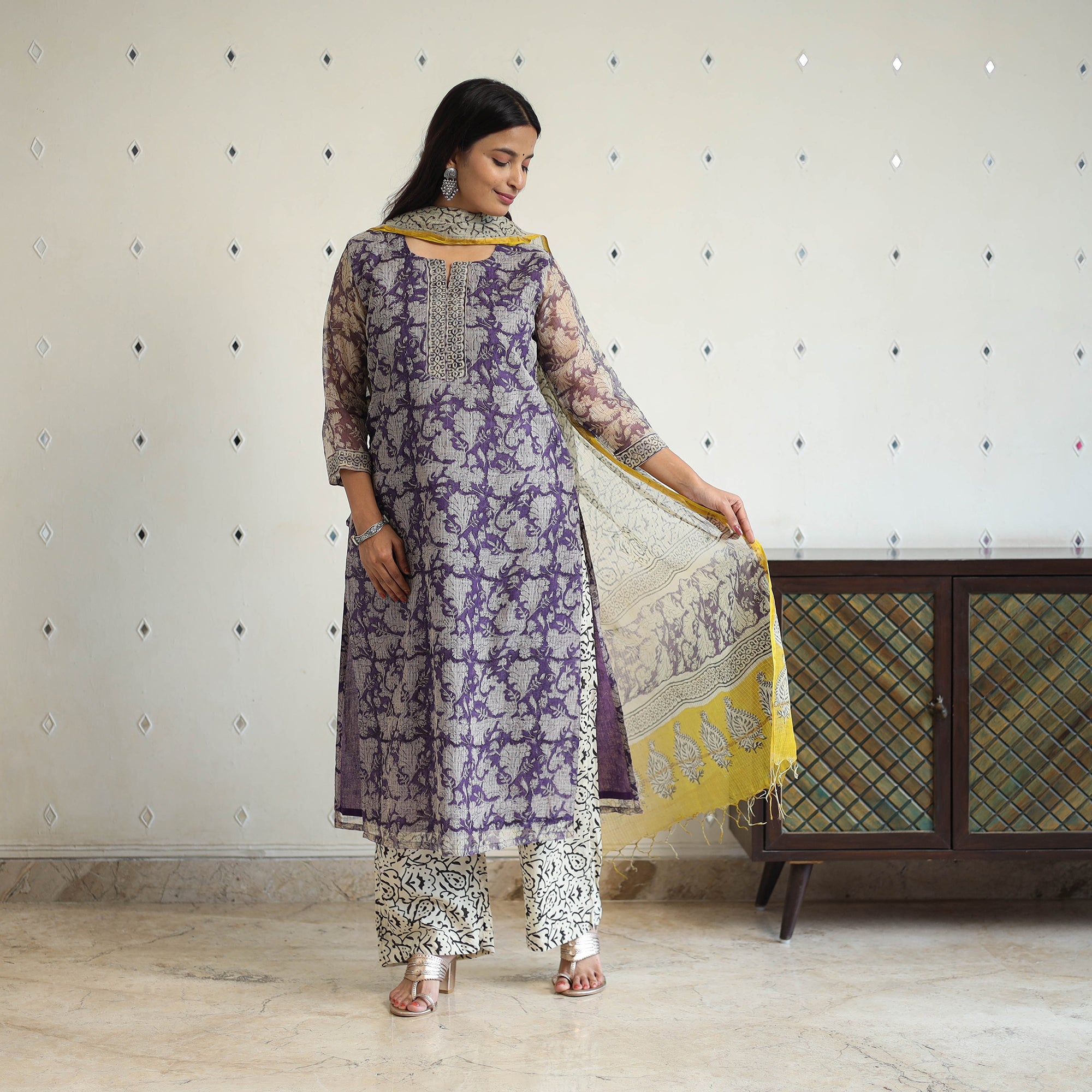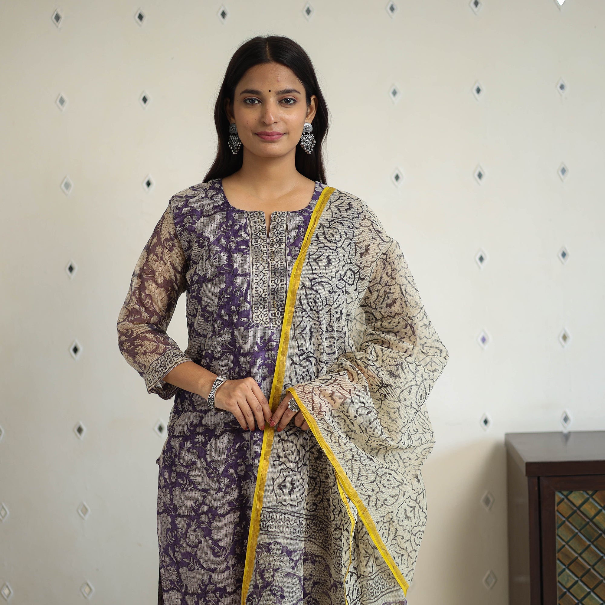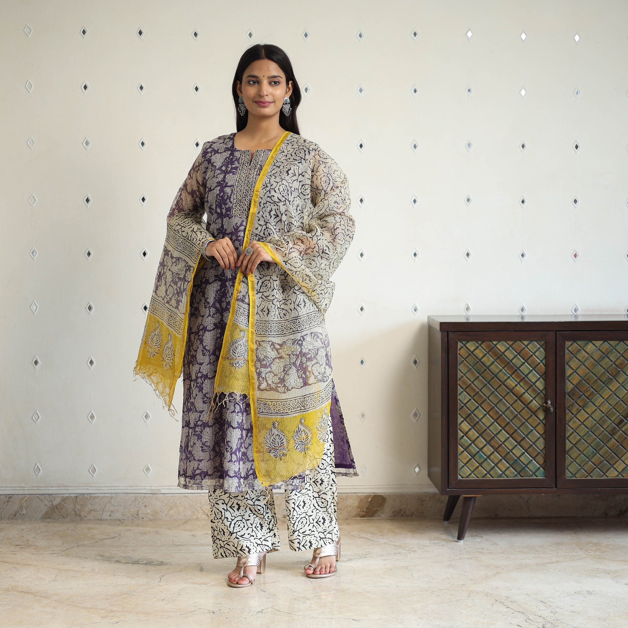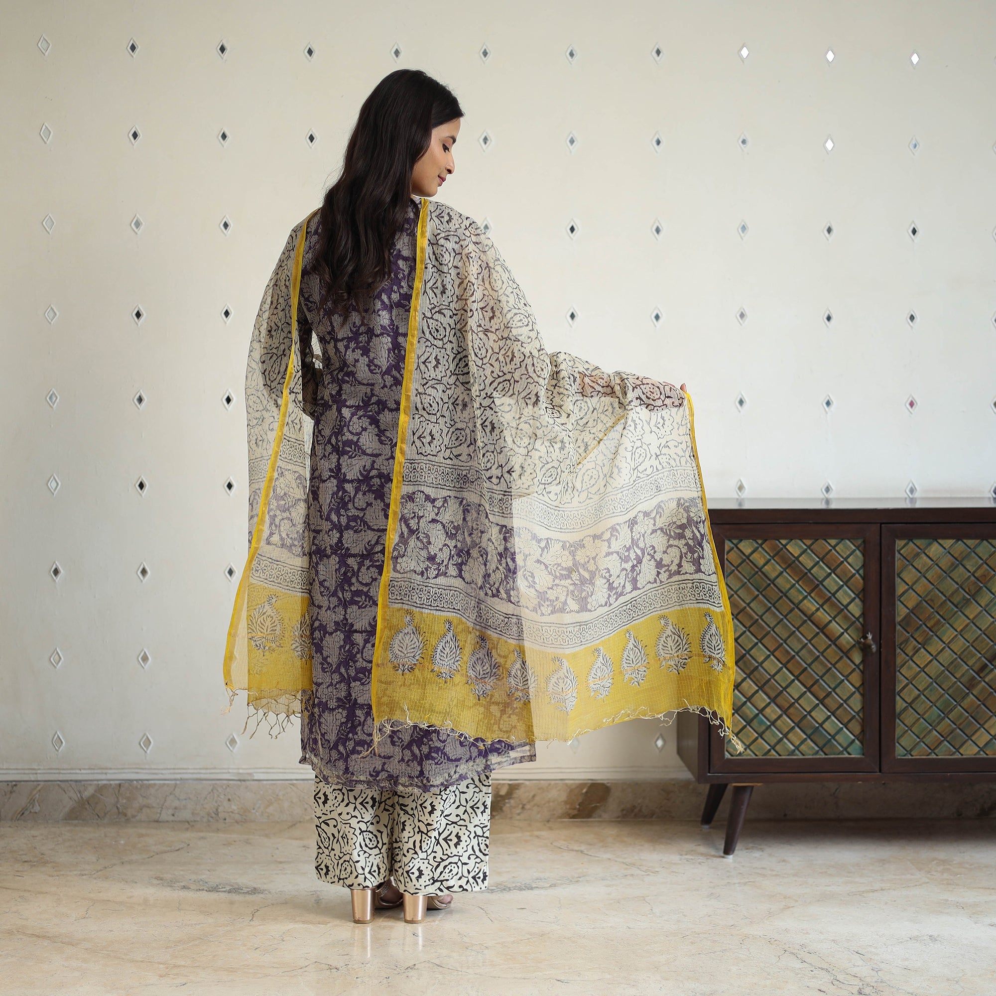 This purple elegant kota doria bagru print kurta set blends comfort with craft. The kurta comes with a handy side pocket, while the cotton palazzo offers two spacious pockets for convenience. The kurta and dupatta are made from airy kota doria, known for its light texture, while the bottom is soft cotton. It's an ideal choice for casual outings and festive occasions alike.