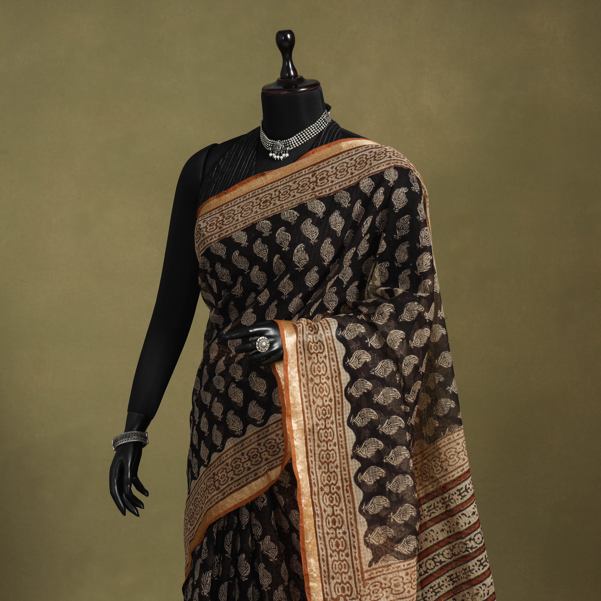 This black bagru kota doria saree is crafted using traditional block printing techniques with natural dyes. Woven in Rajasthan, Kota Doria is a lightweight cotton and silk blend, admired for its airy texture and gentle translucence. Soft, breathable, and easy to drape, this saree is perfect for everyday charm or festive celebrations.