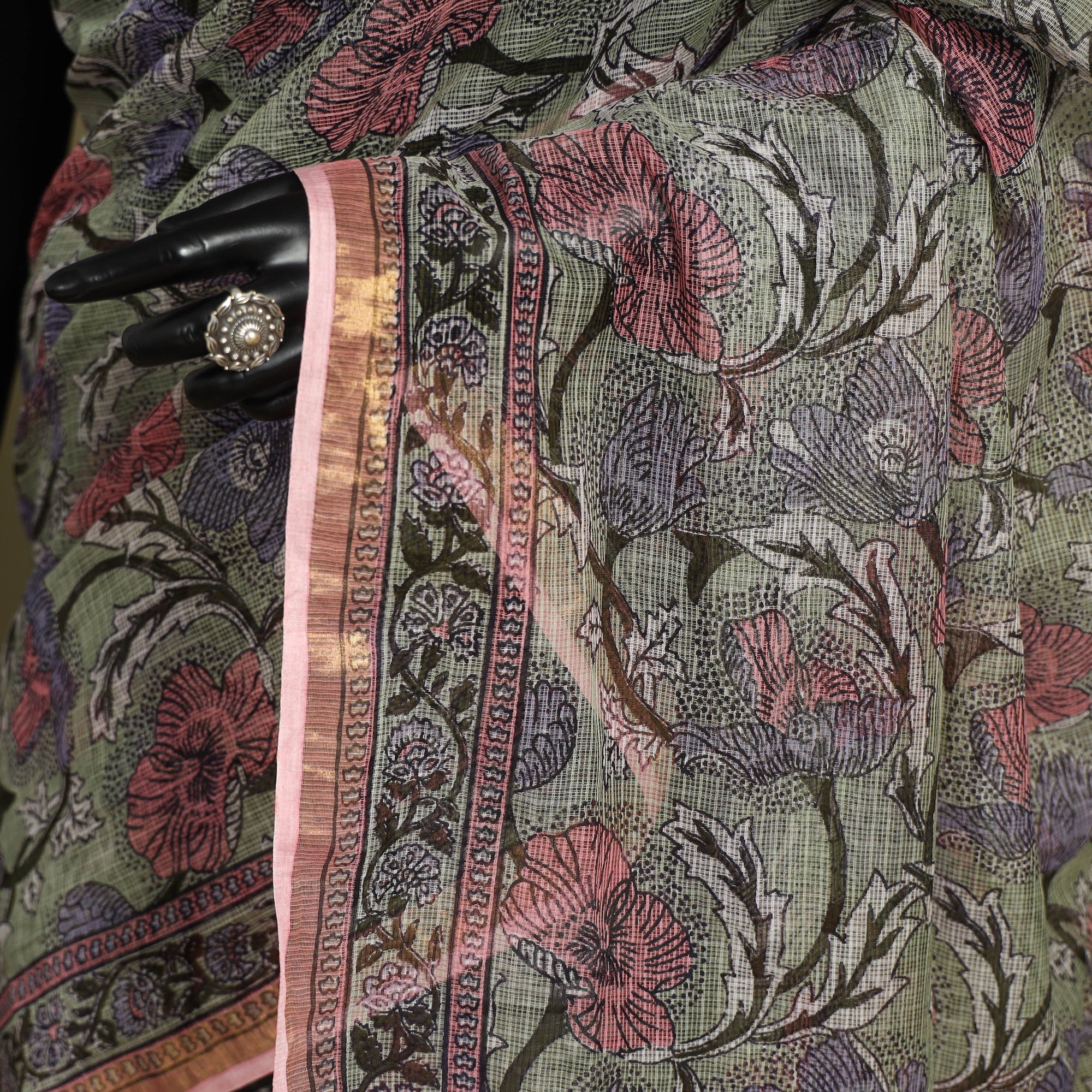 This green kota doria saree, handwoven in Kota, Rajasthan, features a fine cotton-silk blend that drapes light and sheer. Decorated with timeless sanganeri block prints, it showcases elegant floral and geometric motifs. Dyed with bleed-free VAT colours, it maintains its vibrancy while ensuring all-day comfort and breathability. Ideal for both daily elegance and graceful gatherings, it beautifully marries tradition with effortless charm.