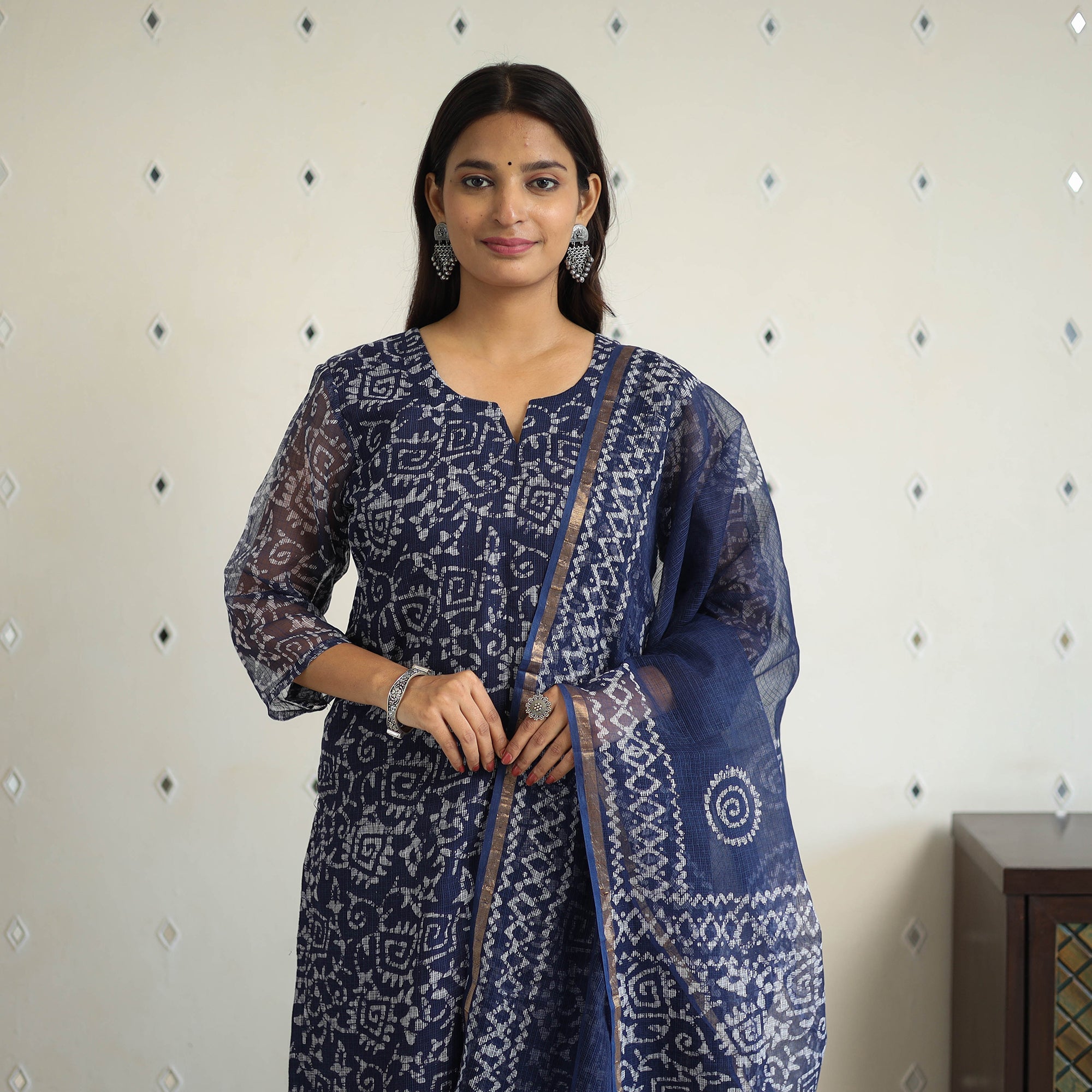 This blue kota doria cotton hand-batik block print kurta set includes a breezy kurta with a convenient side pocket and a matching palazzo featuring dual pockets. The kurta and dupatta are crafted from airy kota doria, a lightweight cotton-silk blend, while the bottoms are made from soft cotton to ensure all-day comfort. Perfectly suited for casual outings or festive gatherings, this ensemble balances everyday ease with understated elegance.