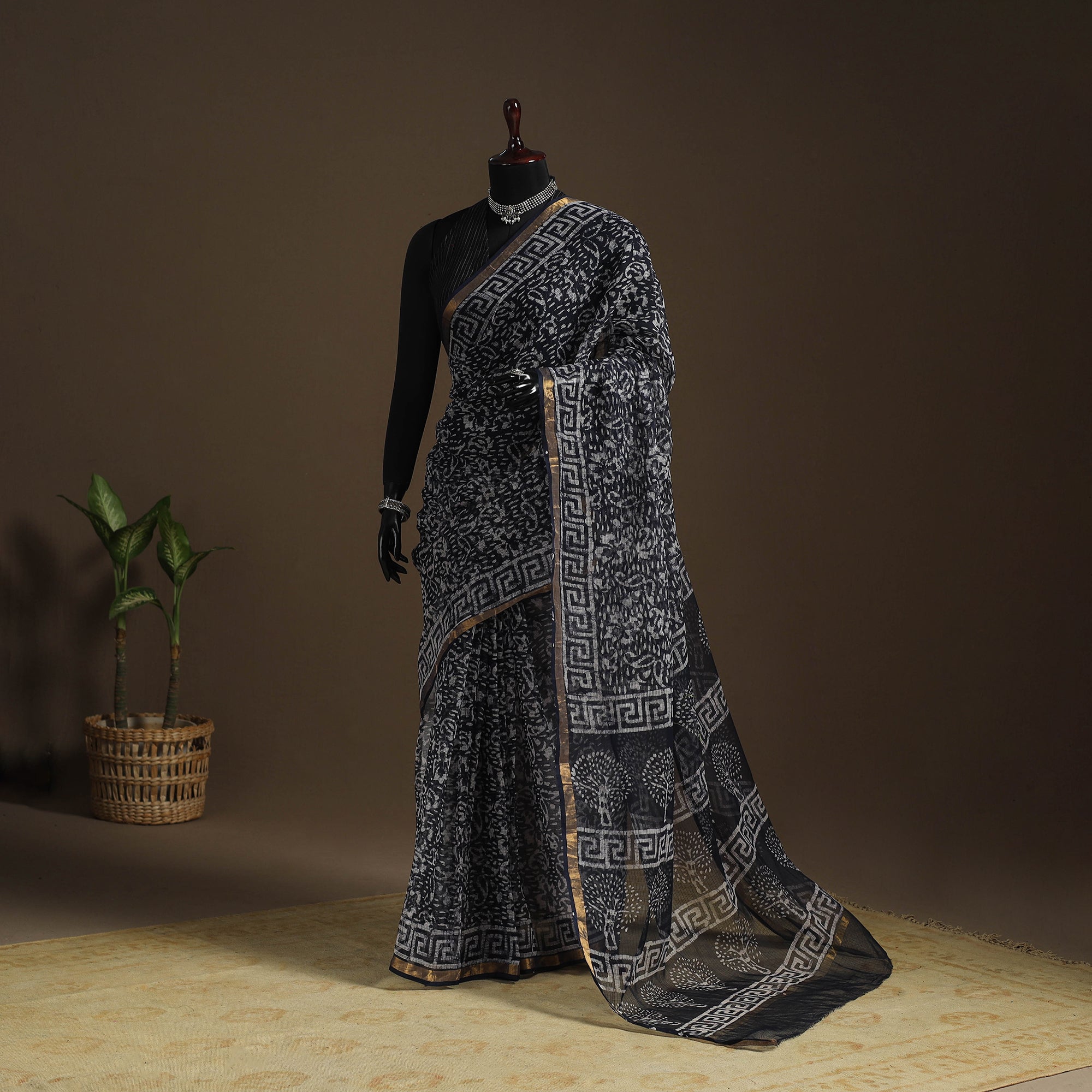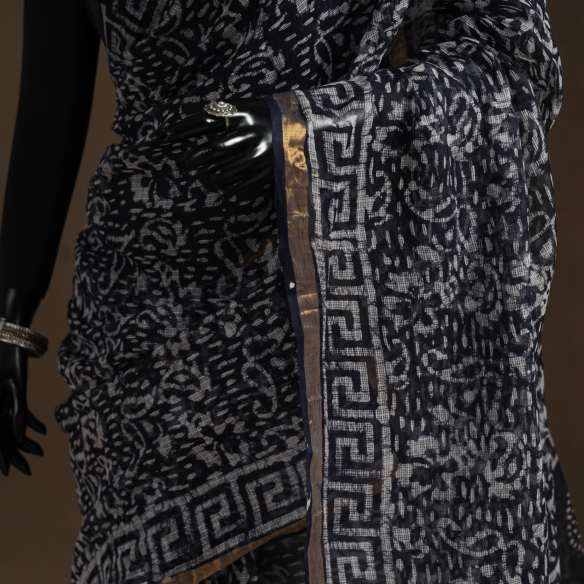 This black hand batik print saree comes from the city of Kota, Rajasthan, where the wax-resist dyeing technique blends beautifully with the airy charm of kota doria cotton. The crackle effect adds rich textural depth to the fabric, while the zari border brings a touch of elegance. Whether it’s a festive celebration, a gathering, or a graceful day out, this saree keeps it light, breathable, and full of artisanal charm.