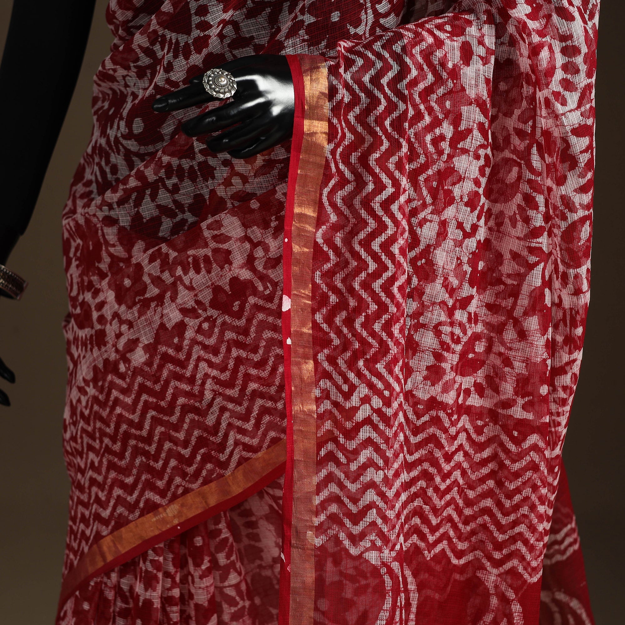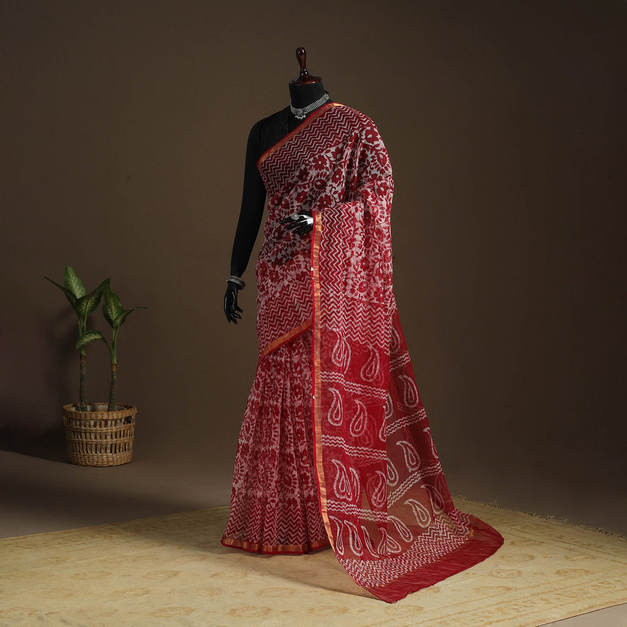 This red hand batik print saree comes from the city of Kota, Rajasthan, where the wax-resist dyeing technique blends beautifully with the airy charm of kota doria cotton. The crackle effect adds rich textural depth to the fabric, while the zari border brings a touch of elegance. Whether it’s a festive celebration, a gathering, or a graceful day out, this saree keeps it light, breathable, and full of artisanal charm.