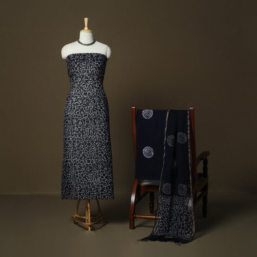 Hand block batik print kota doria cotton 3pc unstitched dress material, crafted by Mohammed Wasim from Ujjain, Madhya Pradesh. It is crafted using the traditional wax-resist dyeing technique, believed to be over 2,000 years old. The kurta fabric and dupatta are made from airy kota doria, an an age-old Indian textile produced in the Kota district of Rajasthan. The fine threads are intricately interwoven to create its characteristic check patterns. Its lightweight and sheer texture give it a grace and elegance of its own. The cotton bottom ensures ease throughout the day, making it ideal for special occasions, cultural gatherings or for adding a touch of traditional elegance to everyday wear.