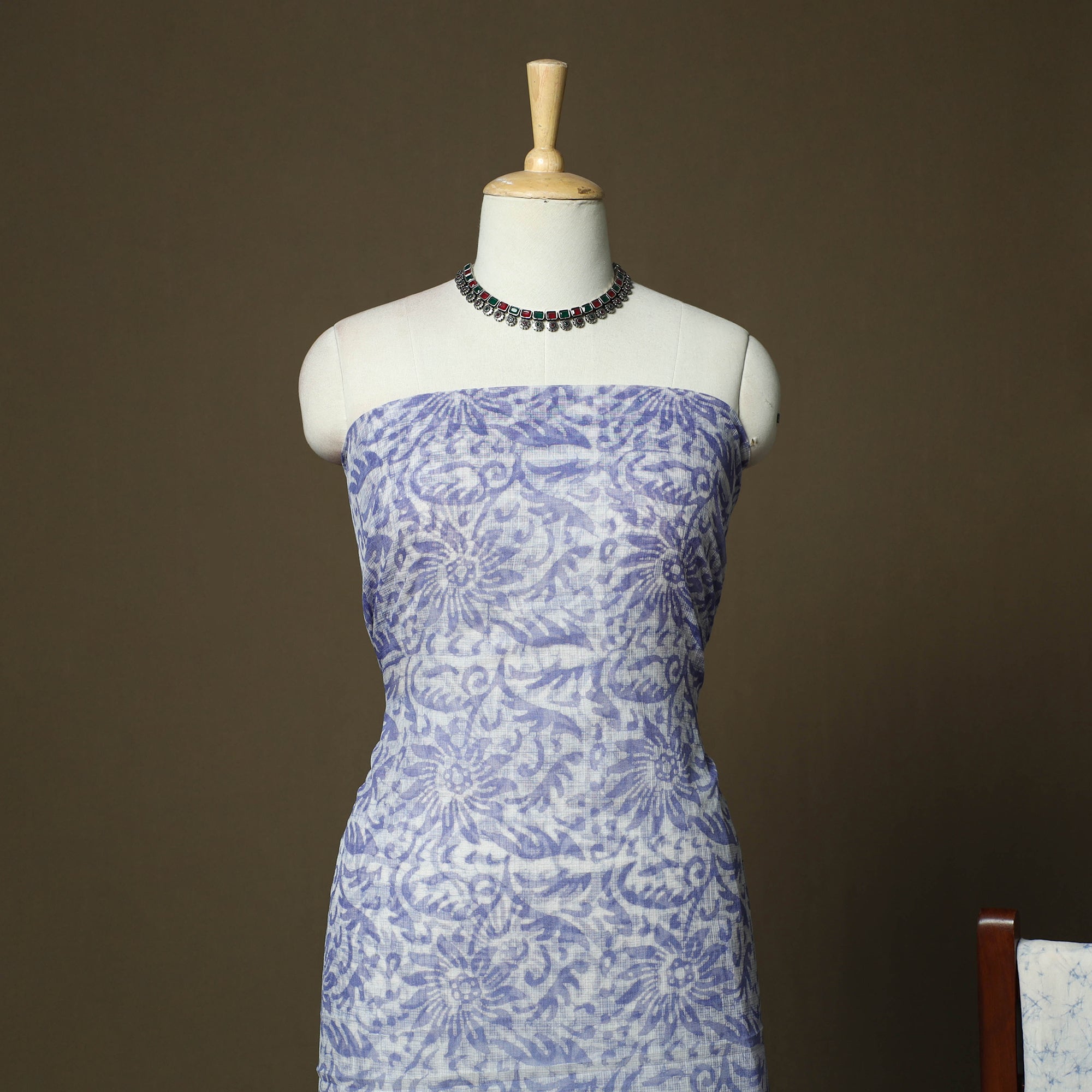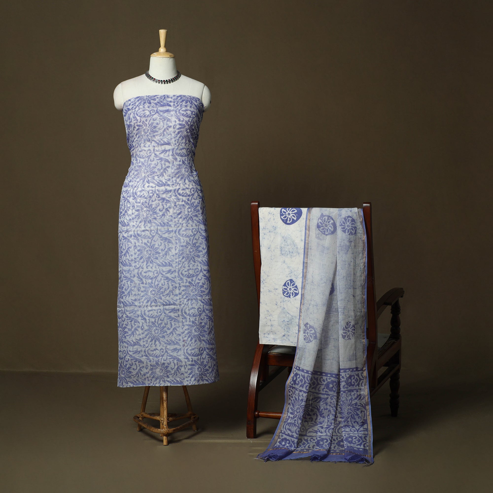Hand block batik print kota doria cotton 3pc unstitched dress material, crafted by Mohammed Wasim from Ujjain, Madhya Pradesh. It is crafted using the traditional wax-resist dyeing technique, believed to be over 2,000 years old. The kurta fabric and dupatta are made from airy kota doria, an an age-old Indian textile produced in the Kota district of Rajasthan. The fine threads are intricately interwoven to create its characteristic check patterns. Its lightweight and sheer texture give it a grace and elegance of its own. The cotton bottom ensures ease throughout the day, making it ideal for special occasions, cultural gatherings or for adding a touch of traditional elegance to everyday wear.