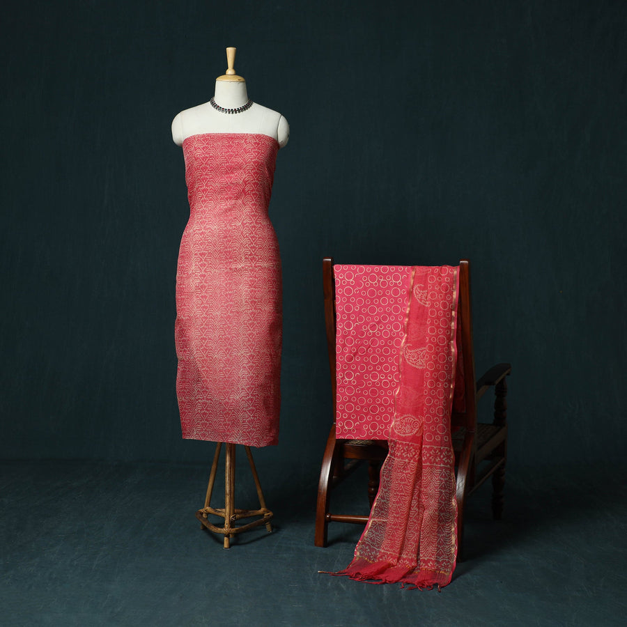 Hand block jaipur print kota doria cotton 3pc unstitched dress material blends traditional artistry with everyday comfort. It is created using the traditional hand block printing technique of Jaipur, Rajasthan. This age-old method is practised by skilled artisans who use hand-carved wooden blocks to produce fine, detailed patterns on the fabric. The kurta fabric and dupatta are made from airy Kota Doria, an age-old textile from the Kota district of Rajasthan known for its finely interwoven check patterns and sheer, lightweight texture. The soft cotton bottom ensures comfort throughout the day, making this set suitable for both daily wear and festive occasions.