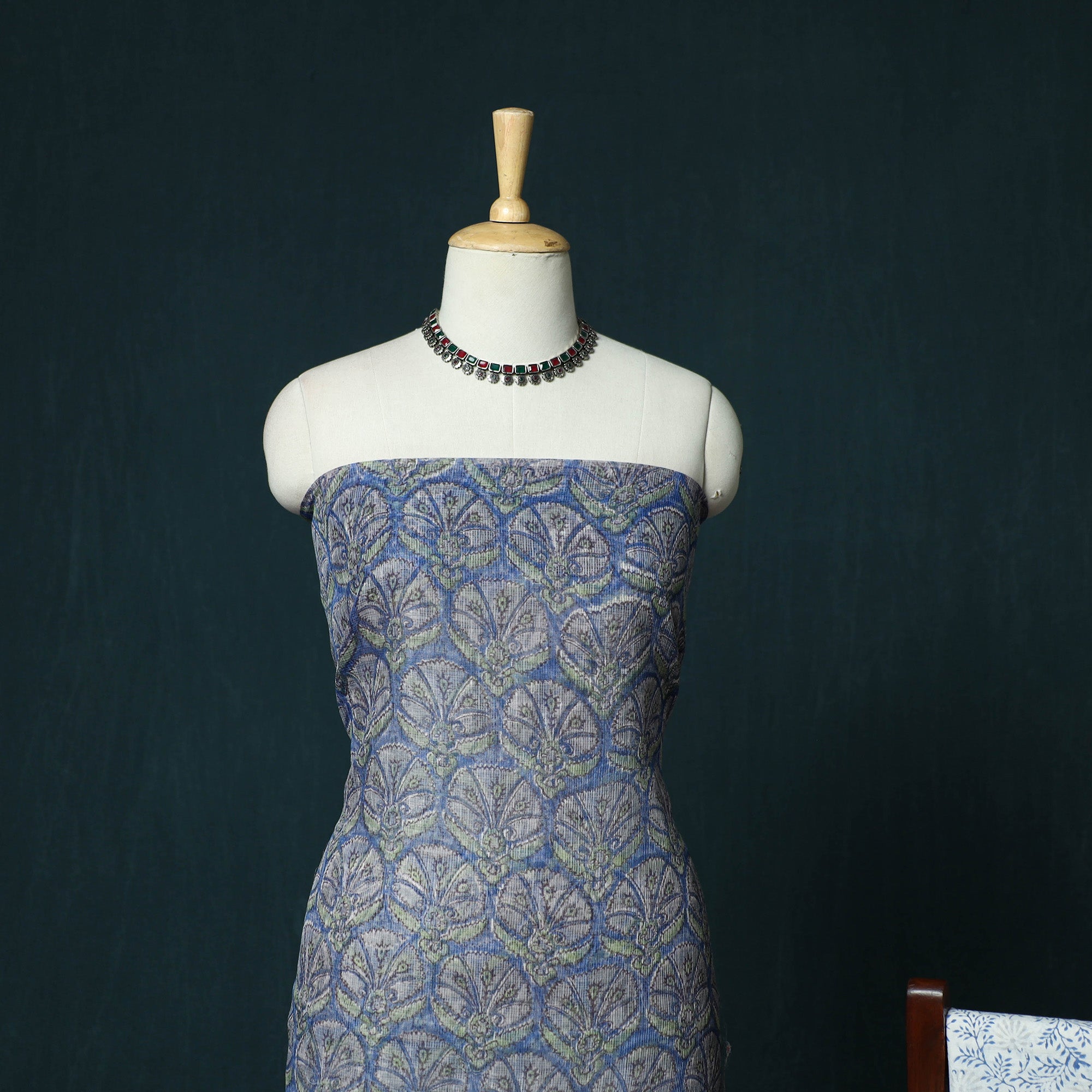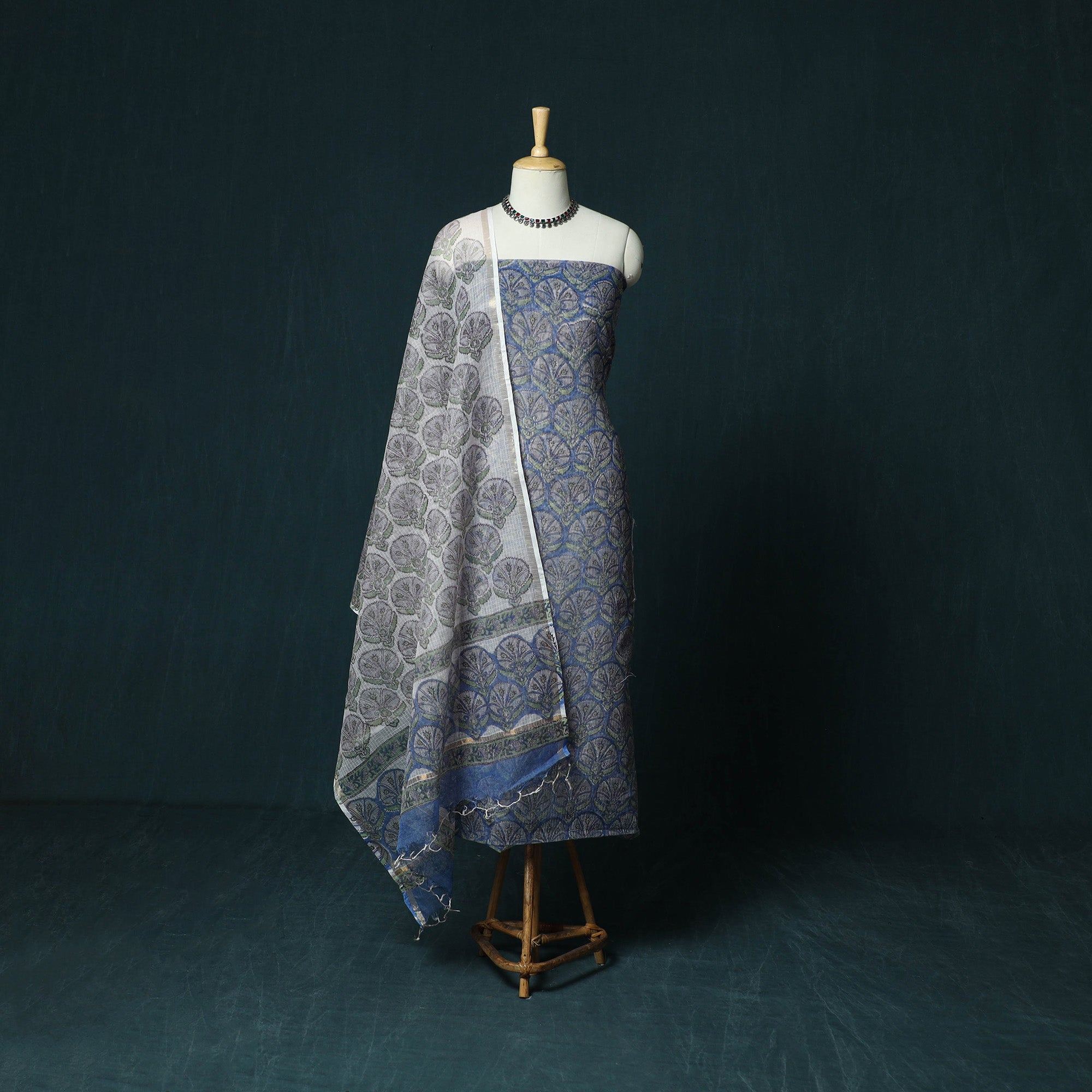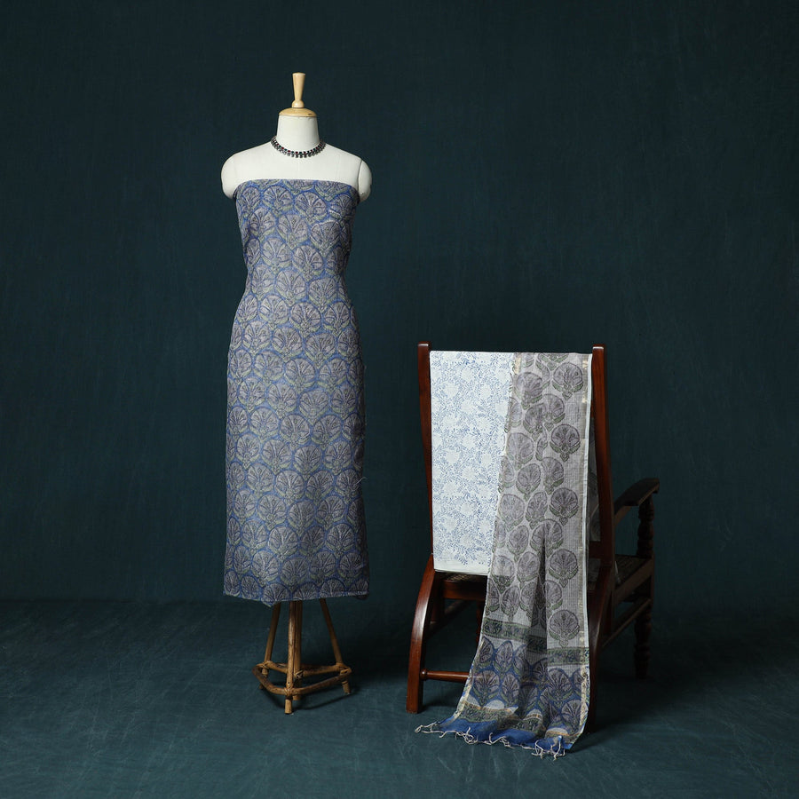 Blue hand block sanganeri print kota doria cotton 3pc unstitched dress material blends traditional artistry with everyday comfort. It is created using the traditional hand block printing technique of Sanganer, a historic town in the southern part of Jaipur, Rajasthan. Practised for over 500 years, this craft is carried forward by skilled artisans, with techniques passed down through generations. Fine patterns are produced using intricately hand-carved wooden blocks. The kurta fabric and dupatta are made from airy Kota Doria, an age-old textile from the Kota district of Rajasthan known for its finely interwoven check patterns and sheer, lightweight texture. The soft cotton bottom ensures comfort throughout the day, making this set suitable for both daily wear and festive occasions.