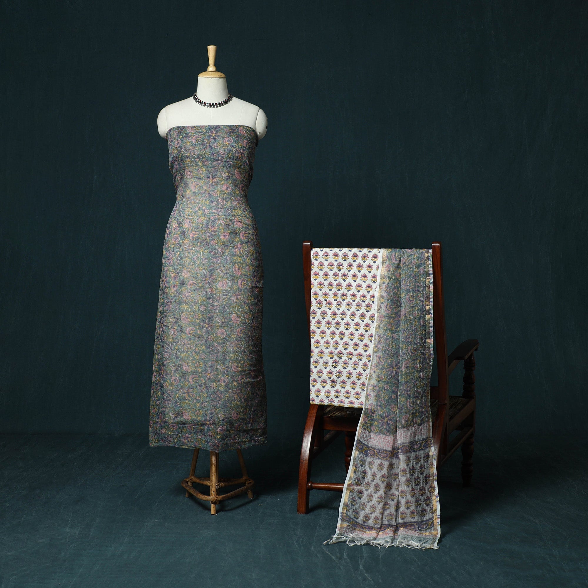 Green hand block sanganeri print kota doria cotton 3pc unstitched dress material blends traditional artistry with everyday comfort. It is created using the traditional hand block printing technique of Sanganer, a historic town in the southern part of Jaipur, Rajasthan. Practised for over 500 years, this craft is carried forward by skilled artisans, with techniques passed down through generations. Fine patterns are produced using intricately hand-carved wooden blocks. The kurta fabric and dupatta are made from airy Kota Doria, an age-old textile from the Kota district of Rajasthan known for its finely interwoven check patterns and sheer, lightweight texture. The soft cotton bottom ensures comfort throughout the day, making this set suitable for both daily wear and festive occasions.