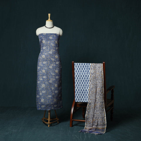 | Material | Blue hand block sanganeri print kota doria cotton 3pc unstitched dress material blends traditional artistry with everyday comfort. It is created using the traditional hand block printing technique of Sanganer, a historic town in the southern part of Jaipur, Rajasthan. Practised for over 500 years, this craft is carried forward by skilled artisans, with techniques passed down through generations. Fine patterns are produced using intricately hand-carved wooden blocks. The kurta fabric and dupatta are made from airy Kota Doria, an age-old textile from the Kota district of Rajasthan known for its finely interwoven check patterns and sheer, lightweight texture. The soft cotton bottom ensures comfort throughout the day, making this set suitable for both daily wear and festive occasions. |