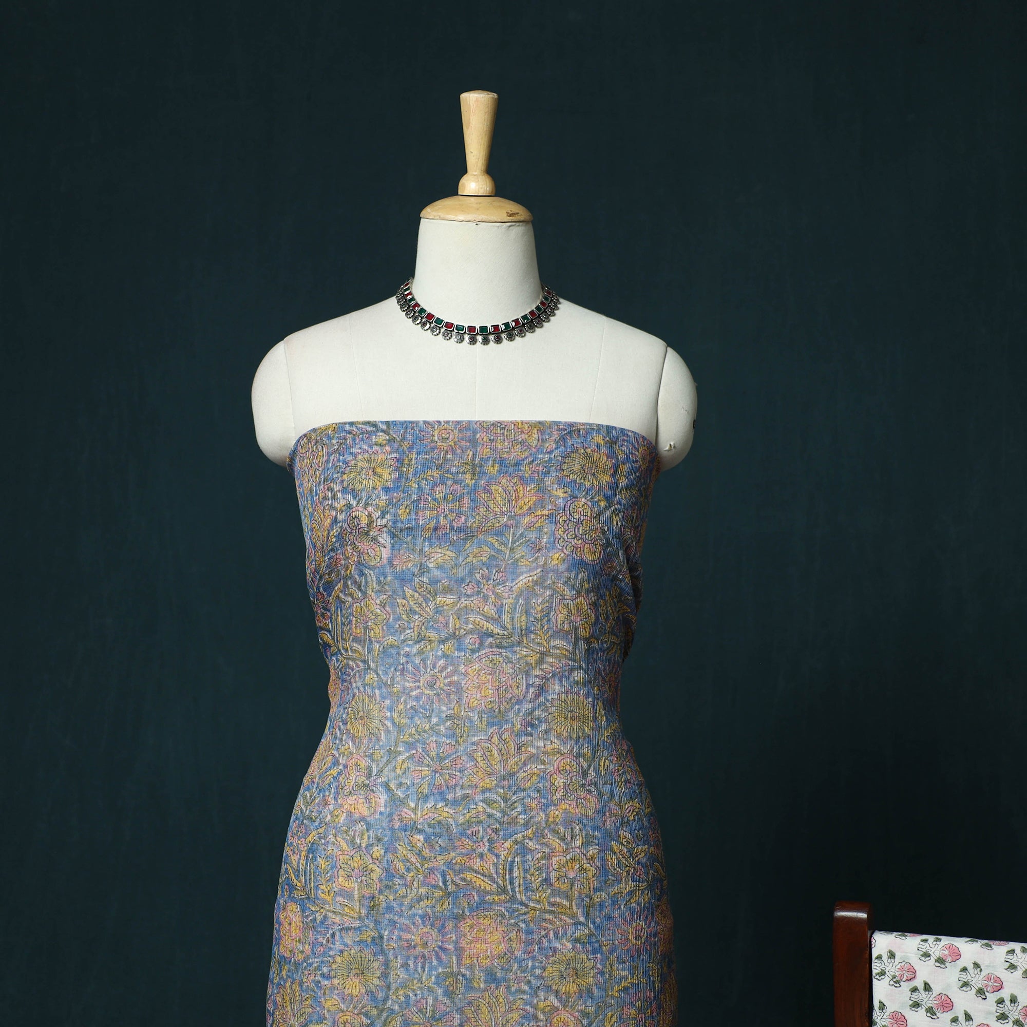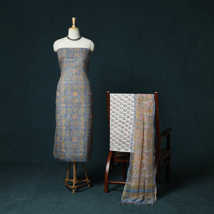 | Material | Blue hand block sanganeri print kota doria cotton 3pc unstitched dress material blends traditional artistry with everyday comfort. It is created using the traditional hand block printing technique of Sanganer, a historic town in the southern part of Jaipur, Rajasthan. Practised for over 500 years, this craft is carried forward by skilled artisans, with techniques passed down through generations. Fine patterns are produced using intricately hand-carved wooden blocks. The kurta fabric and dupatta are made from airy Kota Doria, an age-old textile from the Kota district of Rajasthan known for its finely interwoven check patterns and sheer, lightweight texture. The soft cotton bottom ensures comfort throughout the day, making this set suitable for both daily wear and festive occasions. |